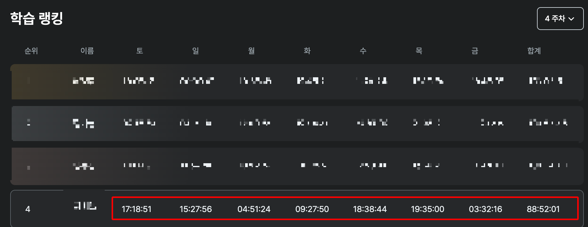 2주 안에 7개의 서비스를 쳐야 했는데 그때 진짜 후회했다. 내가 미친 짓을 시도했구나... 3일 휴가를 써서 미친 듯이 코딩을 했다. 그 주차에 찍은 학습시간이다.