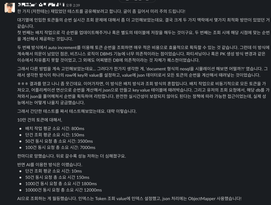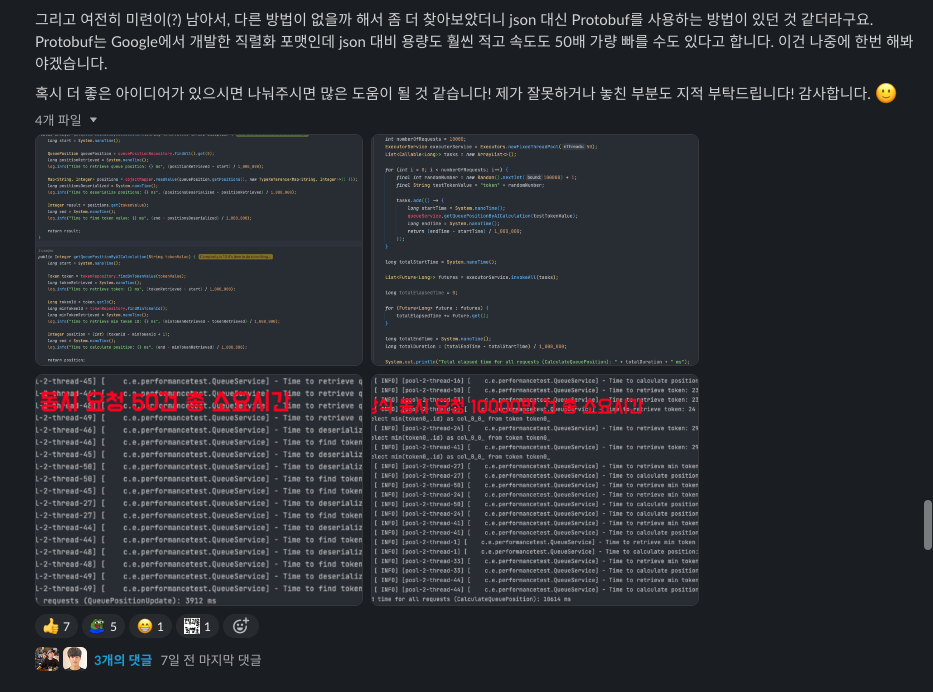 대기열 토큰 순번을 실시간으로 조회하는 방법을 최적화하기 위해 JSON과 AI 방식을 비교했다. JSON 방식은 성능 저하가 심해 실효성이 떨어졌고, AI 방식은 단건 조회 10ms, 10,000건 동시 요청 시 12초로 성능이 우수했다. RDB의 한계를 느껴 Redis와 Protobuf를 사용해 추가 실험을 차후로 기약했다.