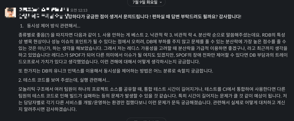 질문: "테스트 코드를 보여주셨는데, 모놀리틱 구조에서 여러 팀원이 하나의 프로젝트 소스를 공유할 때, 통합 테스트 시간이 길어지거나, 테스트를 CI에서 통합하여 사용한다면 다른 팀원의 테스트 코드로 인해 빌드가 실패하는 등의 문제가 발생할 수 있을 것 같습니다. 특히 시간이 길어지는 문제가 클 것 같은데, 실제로 어떻게 대처하고 계신지 궁금합니다."