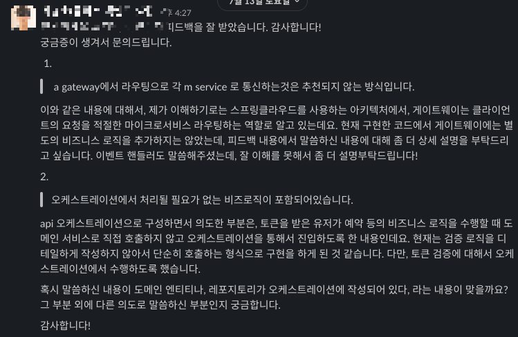 이에 대해서, "마이크로 서비스에 대한 우선적인 신뢰보다는 시스템의 안정성을 높일 수 있는 기능 및 구성에 대해서 고려를 더 많이 해보면 좋을 것 같다"는 피드백을 받았다. 사실 제대로 된 마이크로서비스를 하는 회사가 별로 없다고...ㅋㅋㅋ