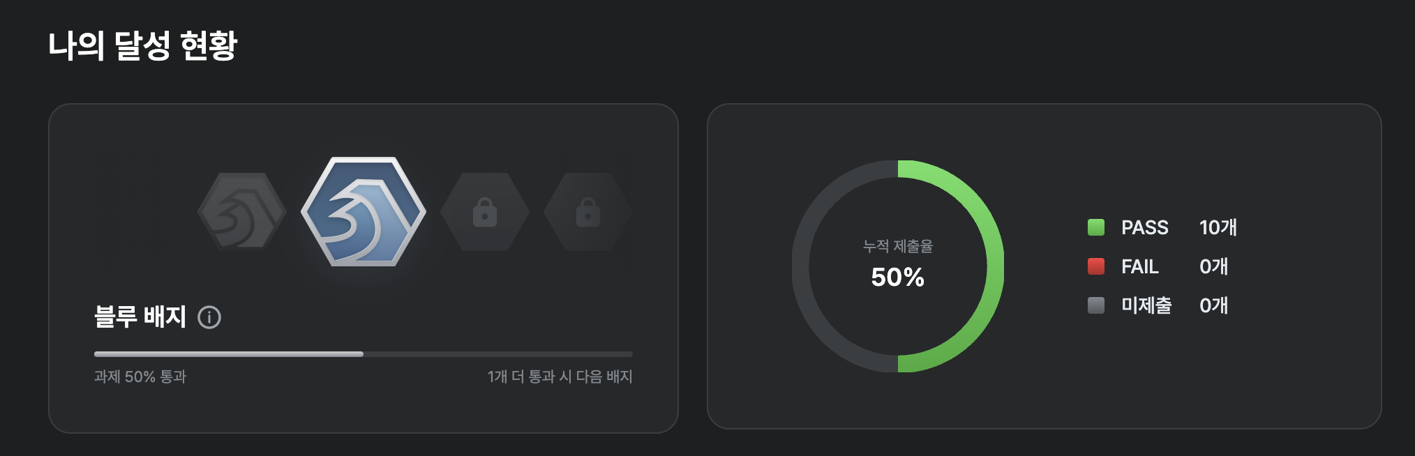 - 블루 배지: 상위 50%, 과제 20% 이상 통과