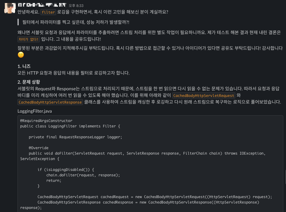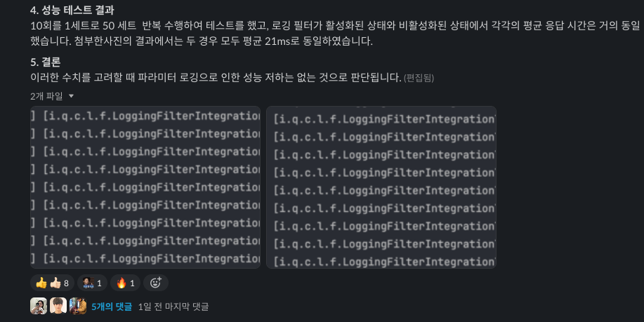 HTTP 요청과 응답의 파라미터를 필터로 로깅할 때 성능 저하 여부를 테스트했다. 서블릿 요청과 응답을 캐싱하여 로깅하는 방식을 사용했고, 10,000개의 문자를 포함한 요청을 50세트로 반복 테스트했다. 로깅 필터가 활성화된 상태와 비활성화된 상태에서 평균 응답 시간은 거의 동일했다(21ms). 따라서 파라미터 로깅으로 인한 성능 저하는 없다고 판단했다.