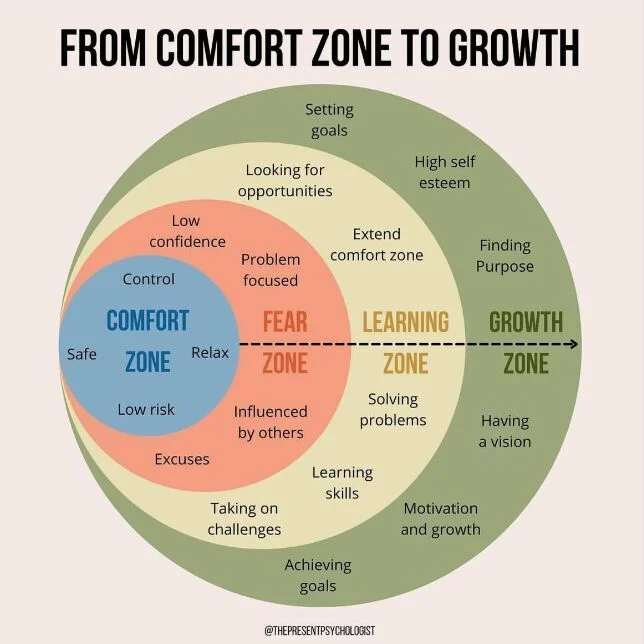 Comfort Zone은 안정성과 익숙함이 있는 공간으로, 개인이 자신감을 가지고 활동할 수 있는 영역이다. 하지만 장기적으로 머물면 성장의 기회를 놓치게 된다. 진정한 성장은 comfort zone을 벗어나 두려움과 불안이 있는 fear zone을 통해 이루어진다.
