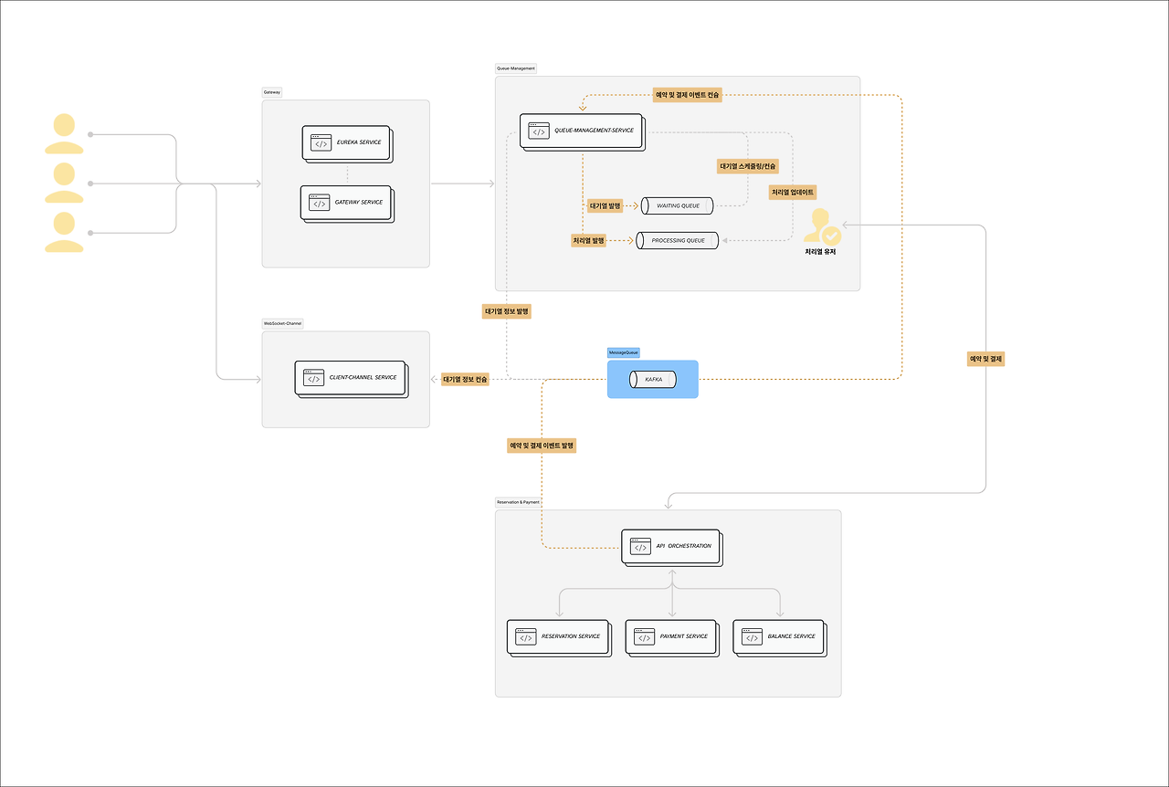 사용자 요청을 대기열에 넣고 순서대로 처리하며 메인 서버에 유입되는 요청량을 제어한다. 시스템 설계 및 구현 과정에서는 대기열 관리를 통해 사용자 요청을 효율적으로 처리하고, 메인 서버의 부하를 줄이며, 성능 최적화와 데이터 일관성 유지를 목표로 한다. 주요 기능으로는 유저 토큰 발급 API, 예약 가능 날짜 및 좌석 조회 API, 좌석 예약 요청 API, 잔액 충전 및 조회 API, 결제 API 등을 갖는다.