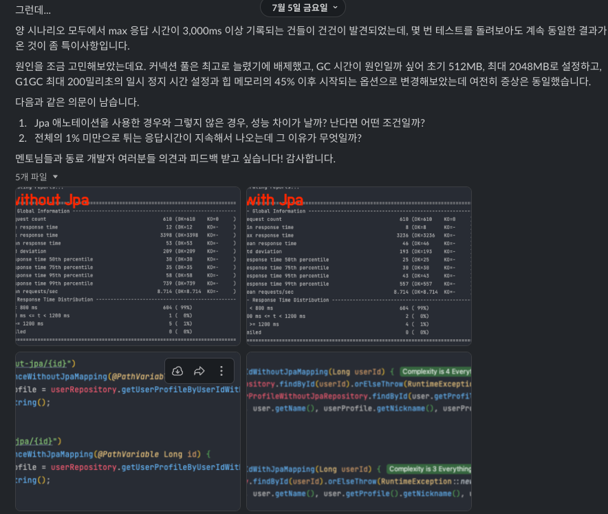 1,000만 건의 데이터에 대해 Gatling을 사용해 테스트했으며, 결과는 평균 응답 시간이 40~60ms로 큰 차이가 없었다. 하지만 양쪽 모두에서 최대 응답 시간이 3,000ms 이상 기록되는 현상이 있었다. 이에 대한 원인이 참 오리무중이어서 도움을 요청했다.