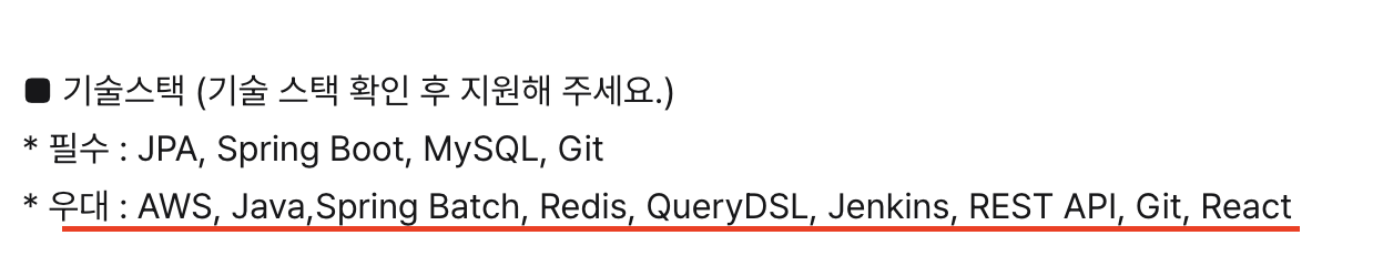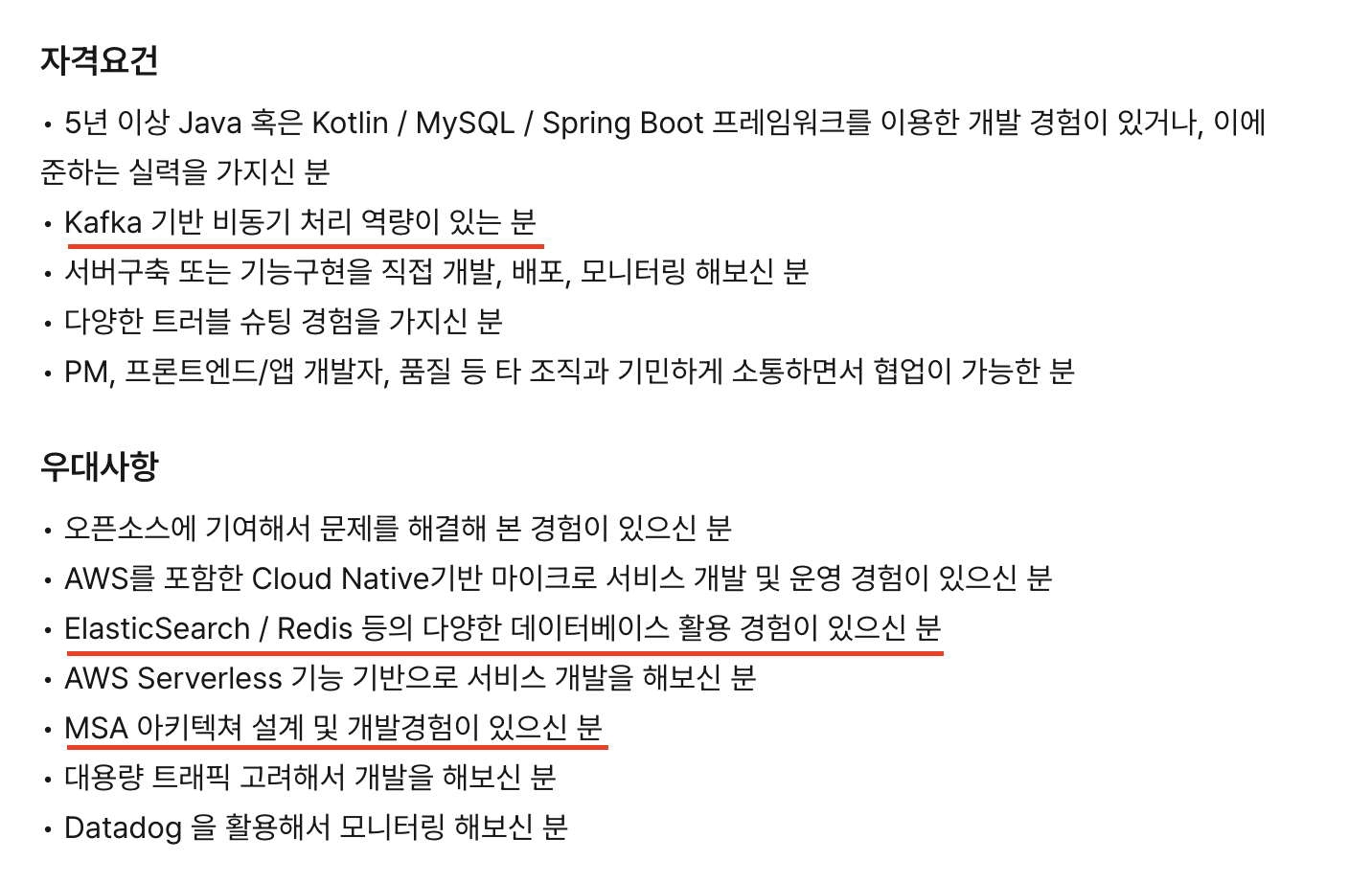 개인적인 경험을 이야기하면, 운 좋게도 첫 직장에서 마이크로서비스에 Kafka와 Redis를 사용하는 환경에서 경력을 시작했다. 덕분에 도커, Redis, Kafka 같은 기술을 익힐 수 있었고, 이력서에 이 기술들을 모두 적어 넣었다. 주니어 0~1년 차였지만, 얼떨결에 3년 차 수준의 기술 스택을 갖췄었다. 그렇게 자격 요건과 일부 우대 요건까지 만족했으니, 서류는 당연히 프리패스였을까?!