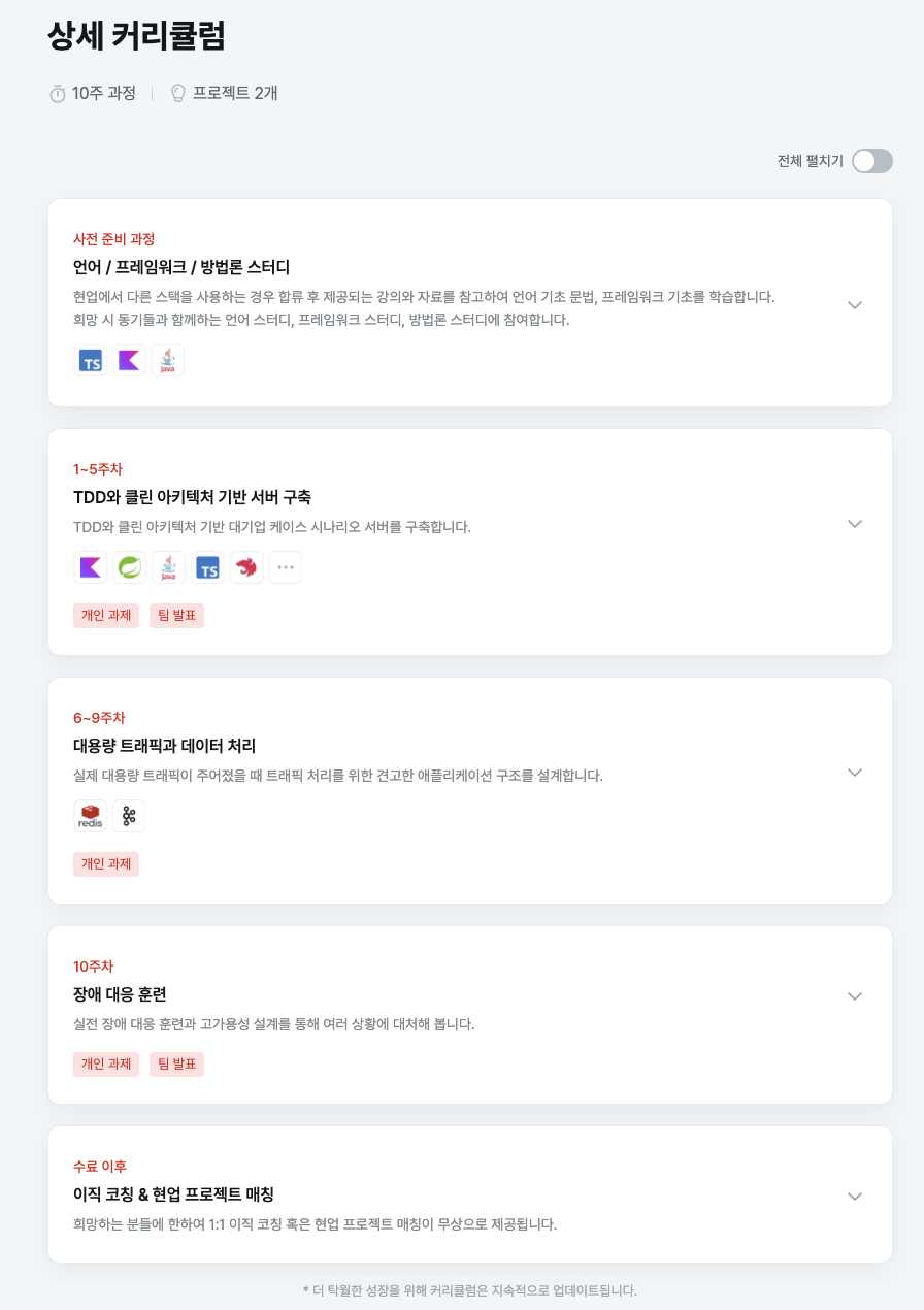 Java17+, Spring, Docker, Kafka, Redis 등 자프링 개발자라면 필수 코스인 스택을 모두 섭렵할 수 있다. 이력서에 이 기술들을 빼곡히 채워 넣을 수 있다는 것만으로도 이미 매력 포인트 충분하다. 게다가 그냥 찍먹하는 게 아니라, 실제 프로젝트에서 '찐'으로 녹여내도록 도와주기 때문에 이건 진짜 큰 도움이 될 수밖에 없다.