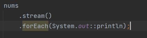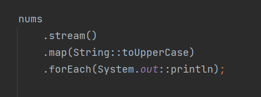 what's new here is the way that we're referencing this method, rather than typing out this method, we are alowing the input to be implied using this new syntax, which is called a METHOD REFERENCE, because it refers an existing method.