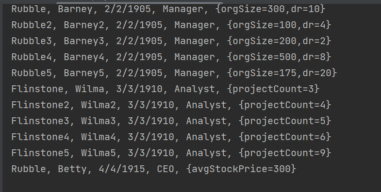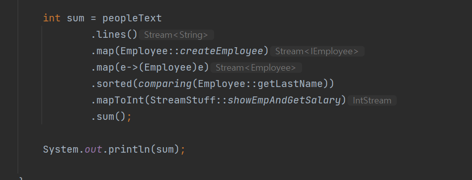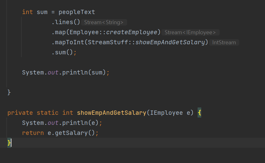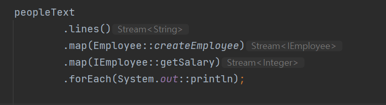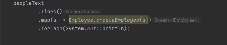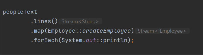 map에서 s를 받고 createEmployees로 건네줌으로써 IEmployee 인터페이스의 return값이 return되고 그것을 foreach로 하나씩 출력하는 구조가 된다.