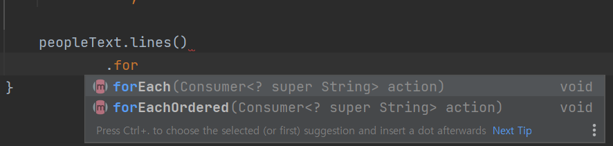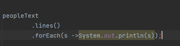 what's happening here is that this line's method is returning a stream of strings, which are the individual line, each string is being fed into the next node, which is here dot + forEach.