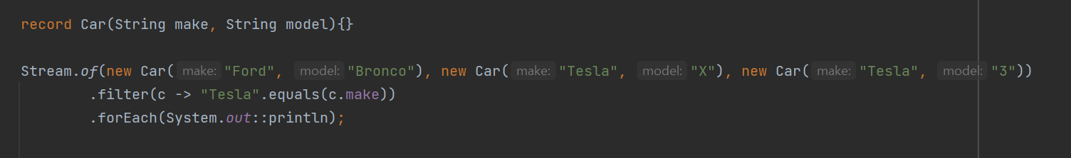 Stream.of(new Car("Ford", "Bronco"), new Car("Tesla", "X"), new Car("Tesla", "3"))