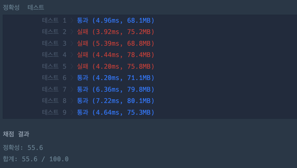 다음과 같이 일부 테스트 케이스에 대해서는 성공하나, 일부에 대해서는 실패한다.