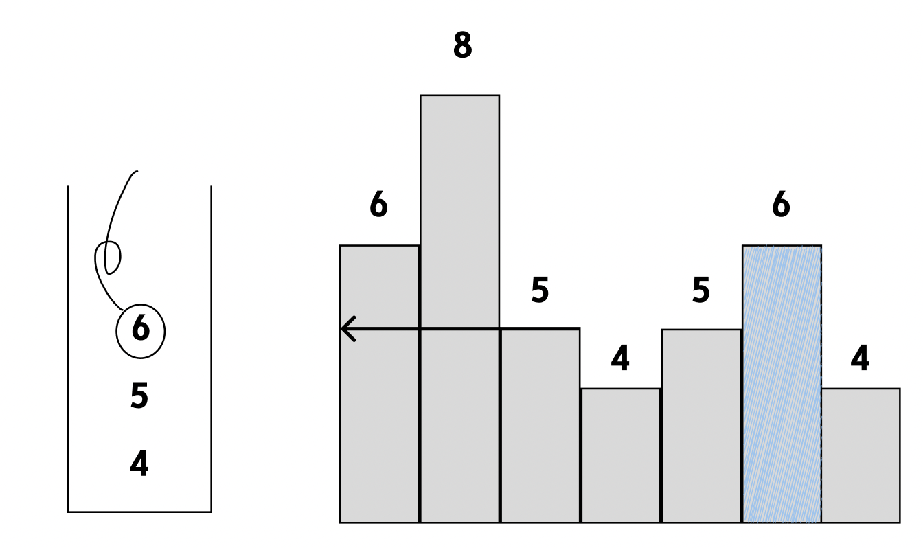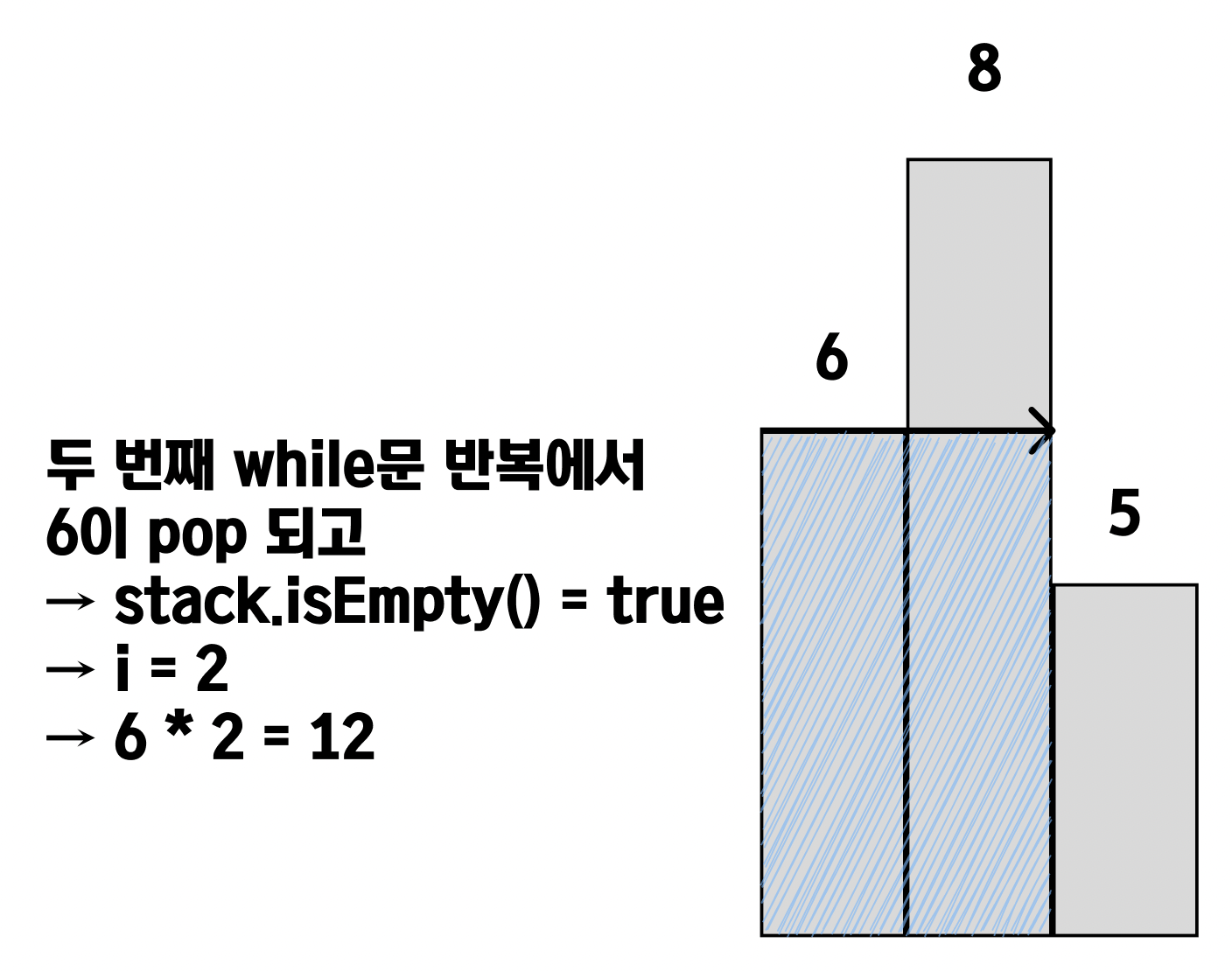 6이 pop된다. 이때 스택에는 아직5가 남아 있으므로, 너비는i - stack.peek() - 1로 계산된다. 즉,6 - 4 - 1 = 1이므로, 넓이는6 * 1 = 6이다. 그림으로 보면 다음과 같다.