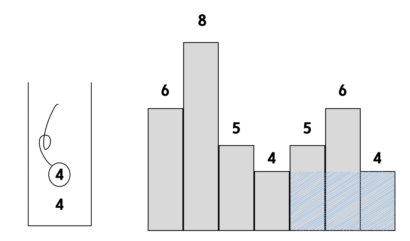 6, 8, 5, 4 에서 이제 5, 6, 4가 추가되는 상황을 생각해보자. i가 3인 시점까지 위에서 계산을 했고, 이제 4만이 스택에 남아 있는 상황이다. 이때, 5, 6은 while문에 타지 않으므로 차례로 스택에 추가되어 다음 그림과 같이 4, 5, 6이 스택에 쌓여 있는 상황이 될 것이다.