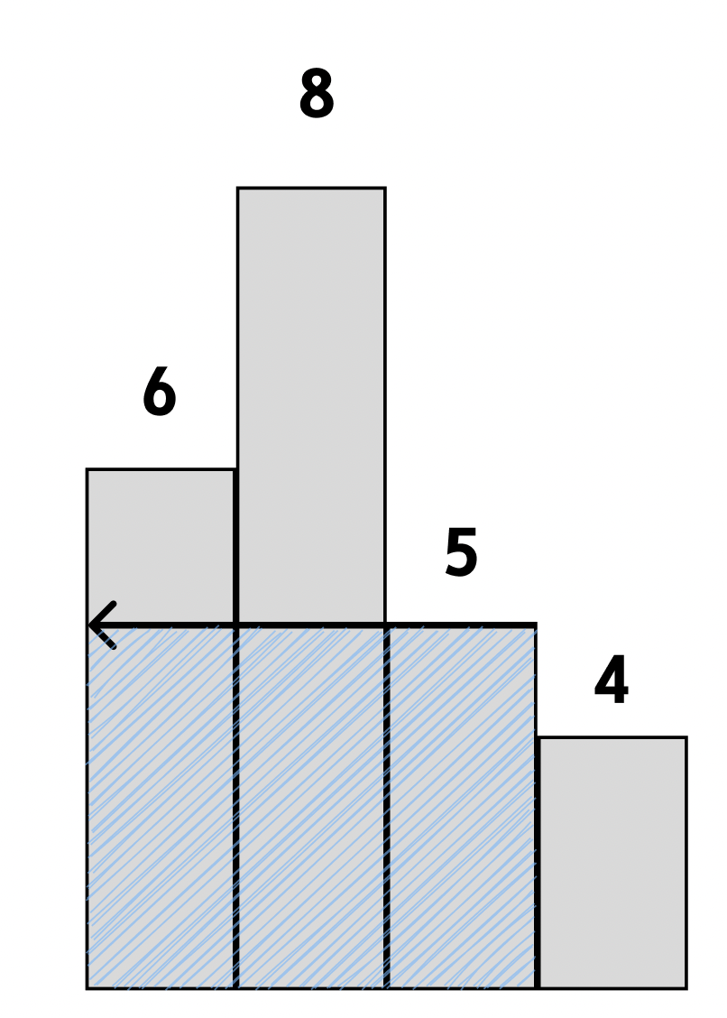 4가 추가 되면 어떨까? 어디가 계산되어야 할까? 5의 입장에서 최대 넓이는 다음 그림에서 보는 것과 같이 처음 시작 지점부터 5 높이까지일 것이다.