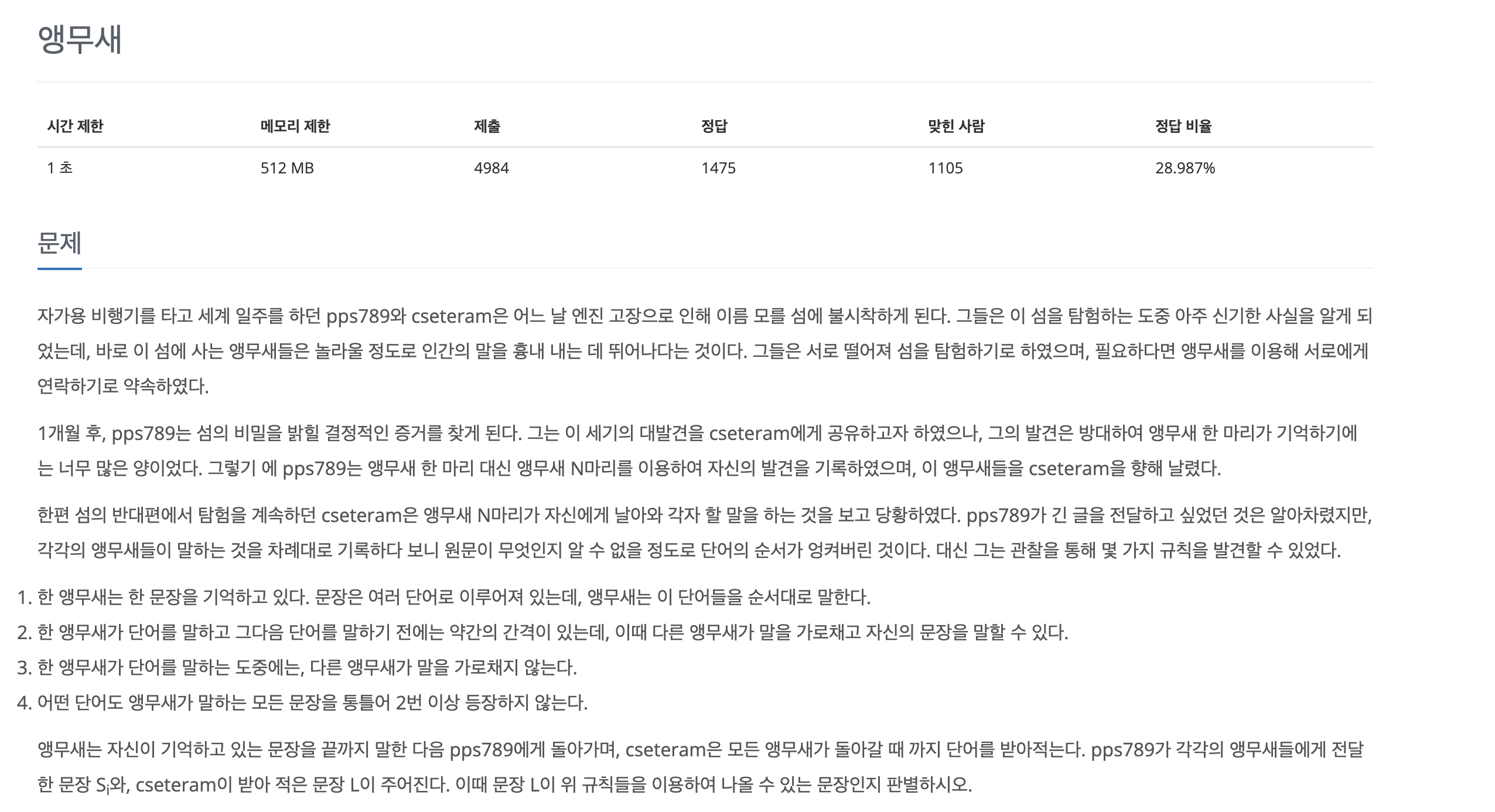 한편 섬의 반대편에서 탐험을 계속하던 cseteram은 앵무새 N마리가 자신에게 날아와 각자 할 말을 하는 것을 보고 당황하였다. pps789가 긴 글을 전달하고 싶었던 것은 알아차렸지만, 각각의 앵무새들이 말하는 것을 차례대로 기록하다 보니 원문이 무엇인지 알 수 없을 정도로 단어의 순서가 엉켜버린 것이다. 대신 그는 관찰을 통해 몇 가지 규칙을 발견할 수 있었다.