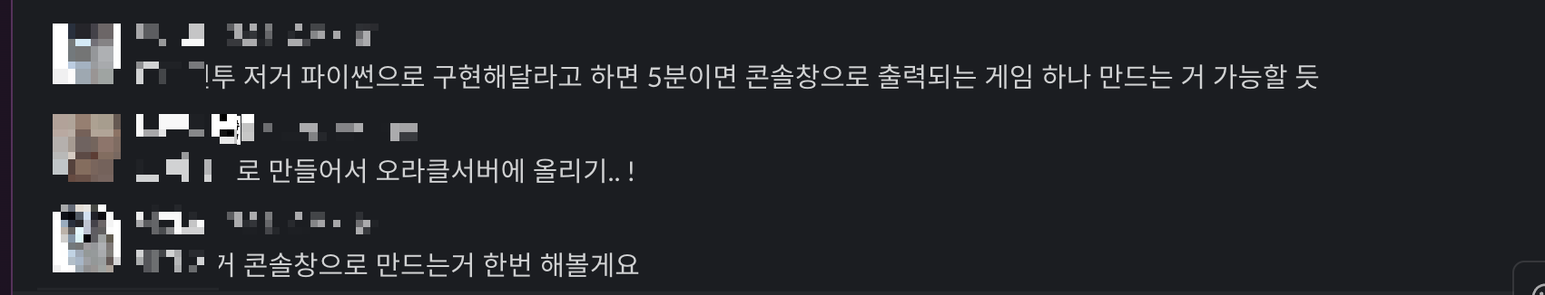 만약 내가 게임 기획자였다면 어땠을까? 혹은 시뮬레이션 게임에 능통한 사람이었다면? 이보다 20배 좋은 퀄리티의 게임을 만들 수도 있지 않았을까? 그런 사람이 존재했다면, 그 사람은 기획자였을까 프로게이머였을까 개발자였을까? 만약에 그런 사람이 파이썬까지 능숙하게 다뤘다면 그런 퀄리티의 게임을 30분 만에 만들 수도 있지 않았을까? 그런데, 그런 존재를 설정하고 나니 하나 떠오르는 무언가가 있다. 낯설고도 친절한 어떤 존재. 그게 바로 GPT 아닌가?