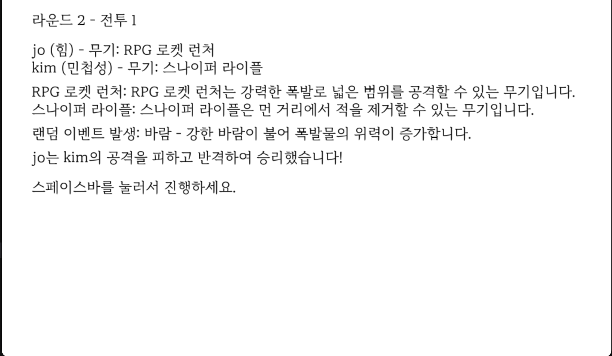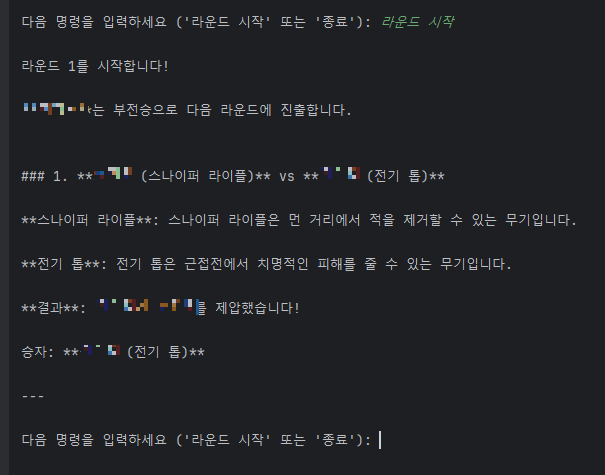 - 라운드 진행: “라운드 시작” 명령을 통해 매 라운드의 대결이 진행된다. 전투는 텍스트로 표현되며, 빠른 진행 속도를 위해 각 라운드가 짧은 지연 시간과 함께 출력된다. 매 대결에서 승자는 랜덤으로 결정되고, 각 라운드마다 남은 인원이 줄어들어 최종 1인 우승자가 남을 때까지 반복된다.