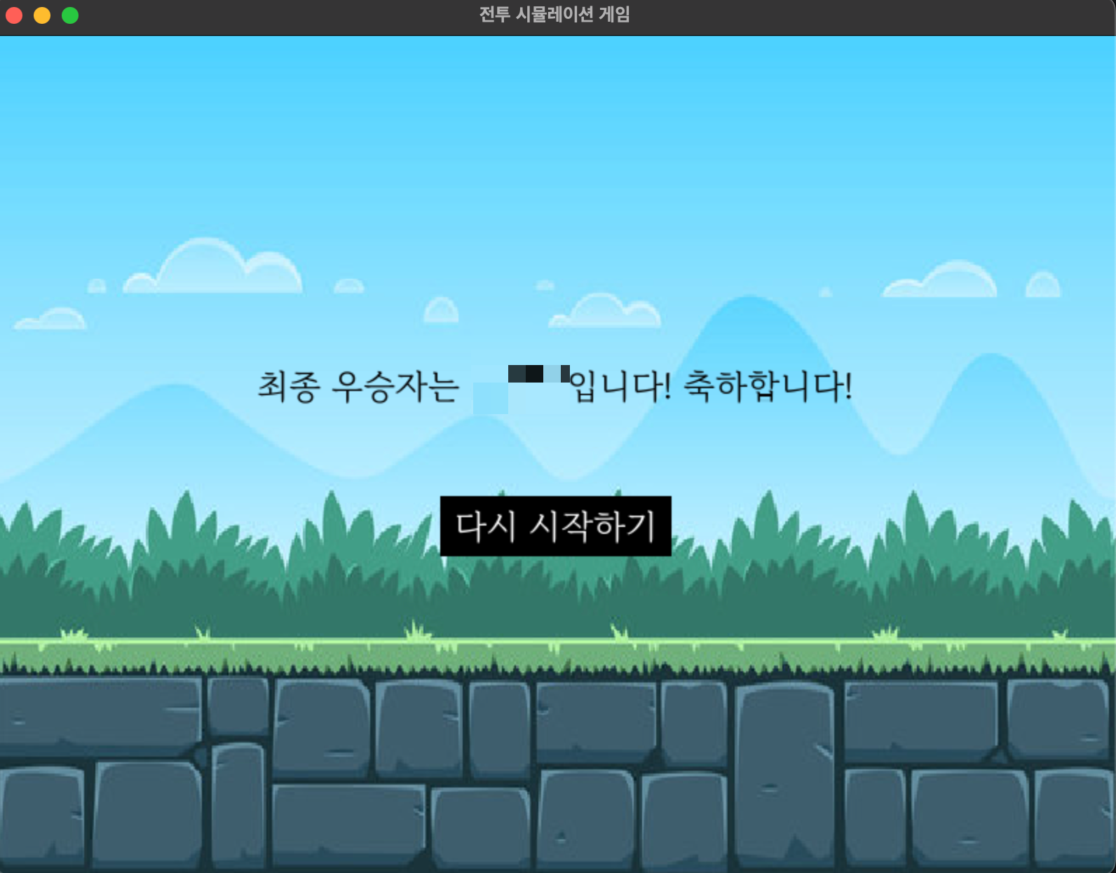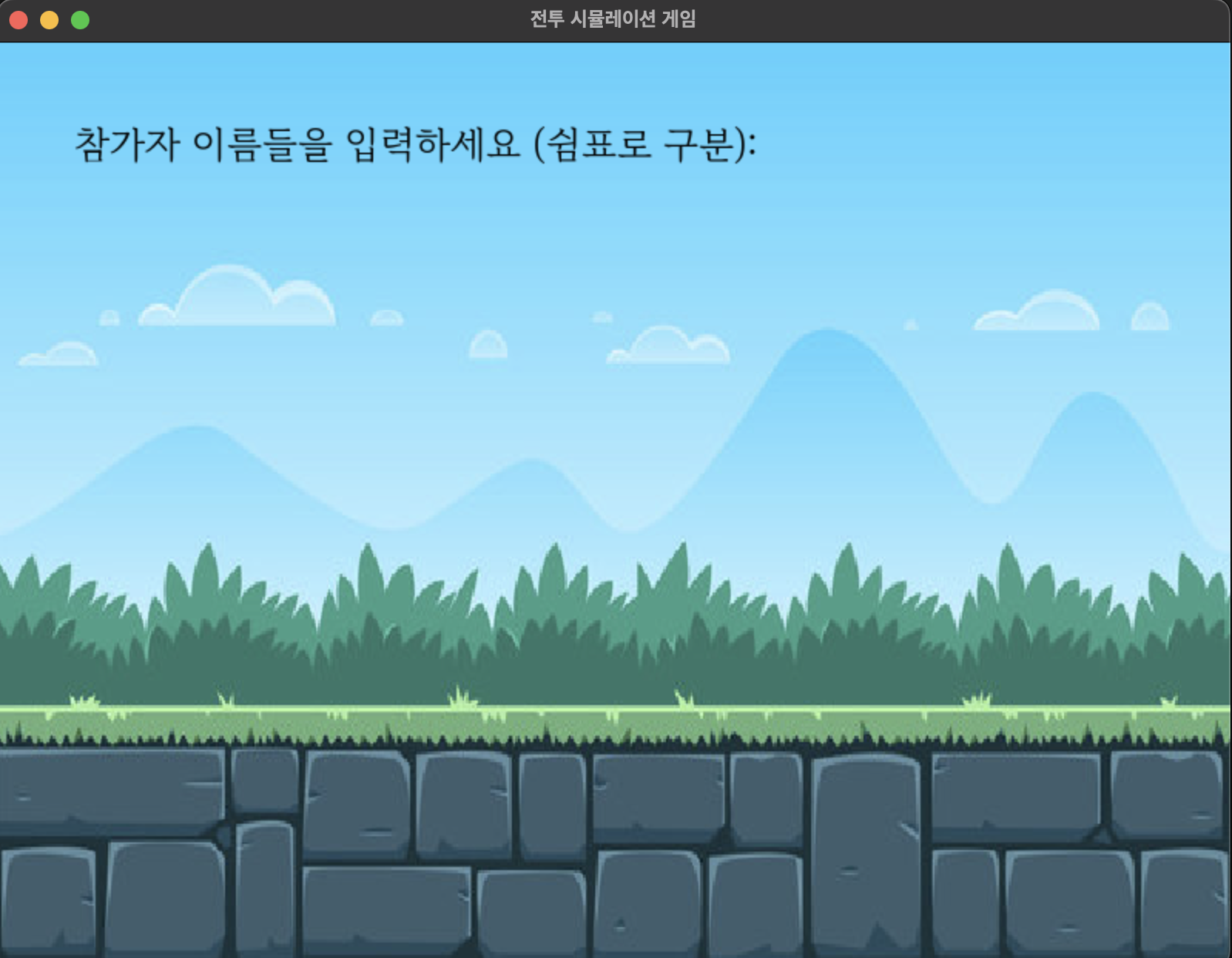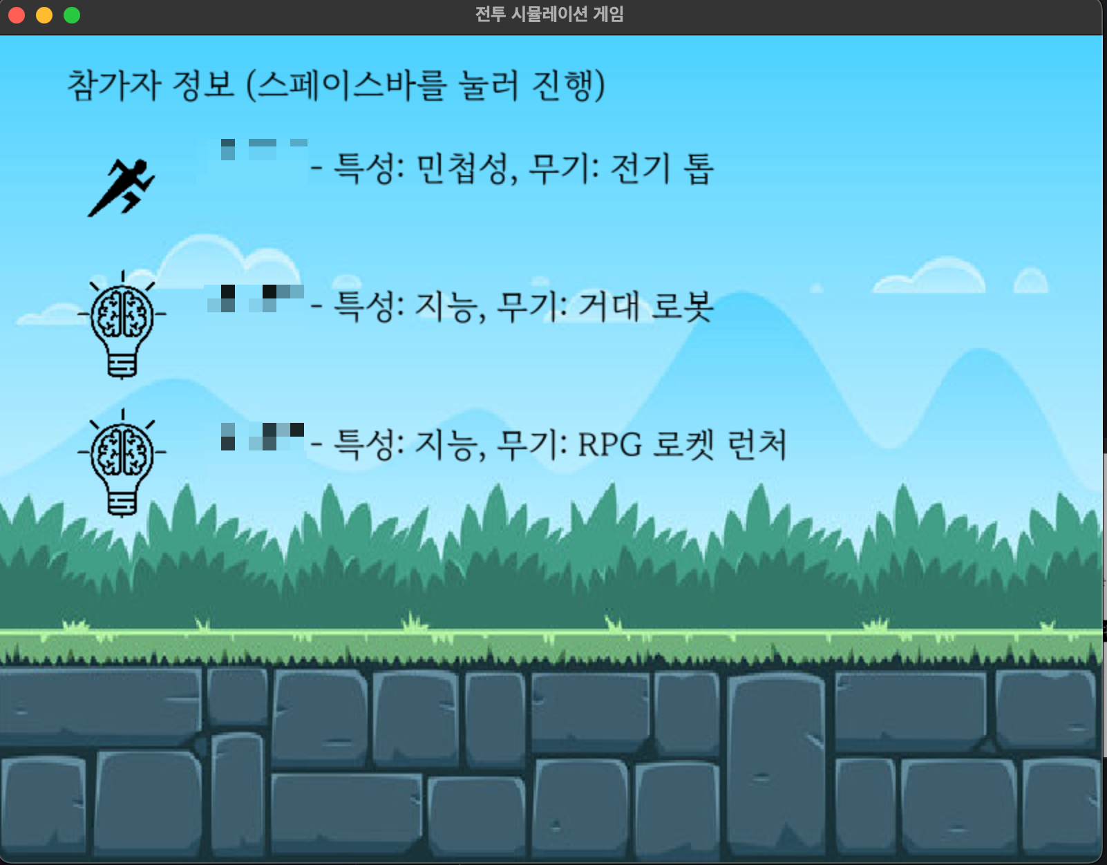 - 참가자 이름 입력: 프로그램이 시작되면 참가자들의 이름을 입력받는다. 이를 기반으로 토너먼트를 시작하게 되며, 이때 모든 참가자에게 무기를 랜덤하게 할당한다.