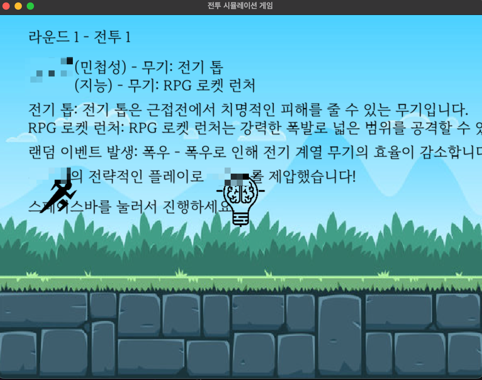 - 좀 더 프로그램을 쉽고 편하게 사용하려면 어떤 것들이 추가되고 수정되어야 하는지 생각하기 → 매 라운드마다 새로운 무기와 속성 설정을 제안하며, 사용자에게 신선함을 주는 게임 구성