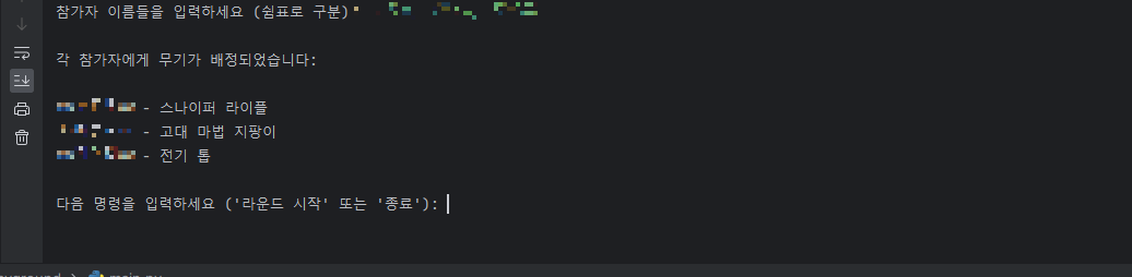 다음과 같은 방식으로 여러 사람을 받은 다음에 가상 전투 상황을 실제 게임처럼 세팅하고, 이를 기반으로 랜덤하게 누가 이길지를 추출하는 콘솔 게임을 만들려고 합니다. 파이썬 콘솔창에서 처음으로 받아야 하는 입력은 사람 이름들입니다. 그런 후 "라운드 시작" 과 같은 다음 명령어를 수행하면 1라운드에 대한 결과가 마치 실제 전투가 진행되는 것과 같은 속도(너무 느리면 안됨)와 텍스트로 출력되어야 합니다. 그렇게 라운드 결과가 나오면 유저가 다음 진행을 명령하면 또 같은 것을 반복합니다. 이렇게 하여 최종 1인 위너를 선출합니다. 내부적으로 작동해야 하는 로직은 입력으로 받은 유저에 대해 랜덤으로 섞어 매번 다른 결과를 내주어야 한다는 것이며, 게임이 작동하는 것과 같은 상황을 연출하되, 이를 텍스트형 콘솔로 출력해주어야 한다는 것입니다. 이러한 요구사항과 원리에 따라 파이썬 코드로 해당 프로그램을 작성해주세요.