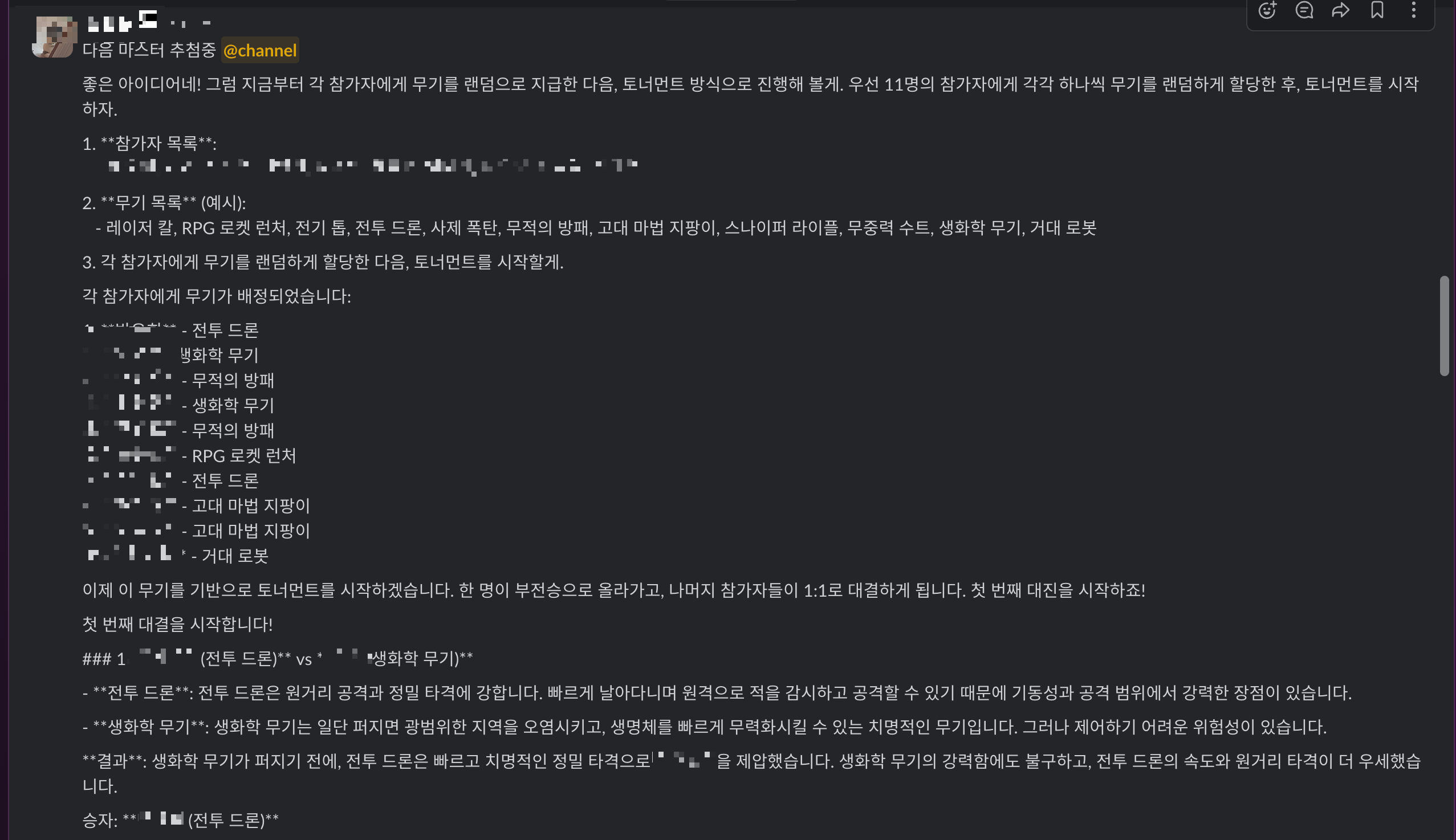 말하자면, ChatGPT를 통해 참가자들에게 무기를 랜덤으로 배정하고, 그 무기들로 토너먼트 대결을 벌이는 가상의 전투 시나리오를 진행한 것이다. 참가자 11명에게 무기들이 하나씩 랜덤 배정되었고, 이들은 1:1 대결을 통해 최종 승자를 가리게 되었다.