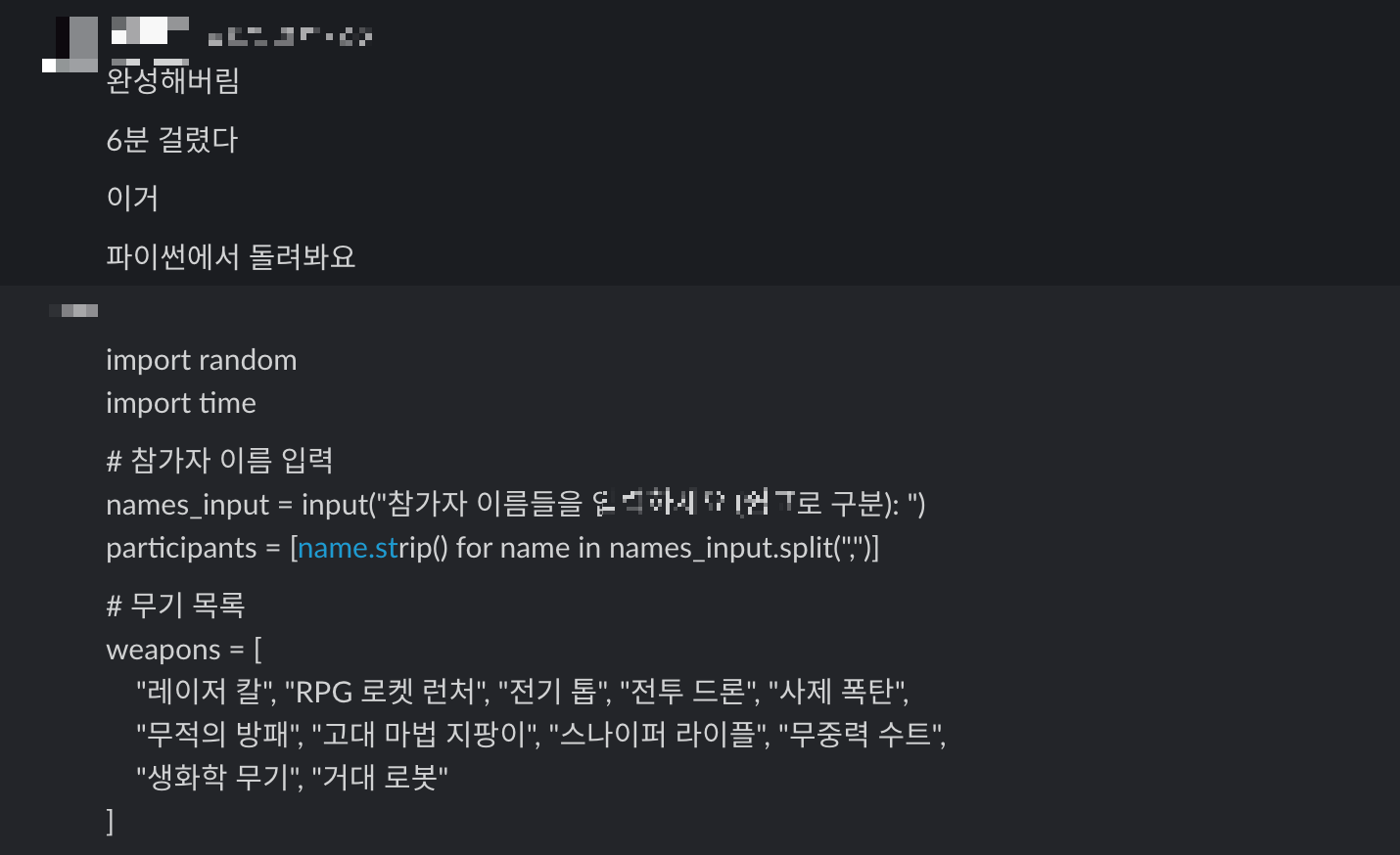 제비 뽑기를 할 수도 있고, 지목을 할 수도 있고 혹은 핀볼을 돌릴 수도 있지만 전투 시뮬레이션을 통해 한 명을 선정한다는 것이 재밌었다. 그러다 문득, 걸 아예 프로그램으로 만들어볼 수 있지 않을까? 하는 생각이 떠올랐다. 그리고 ChatGPT라면 이 정도 프로그램은 아주 쉽게 짤 것 같다는 예감이 들었다.