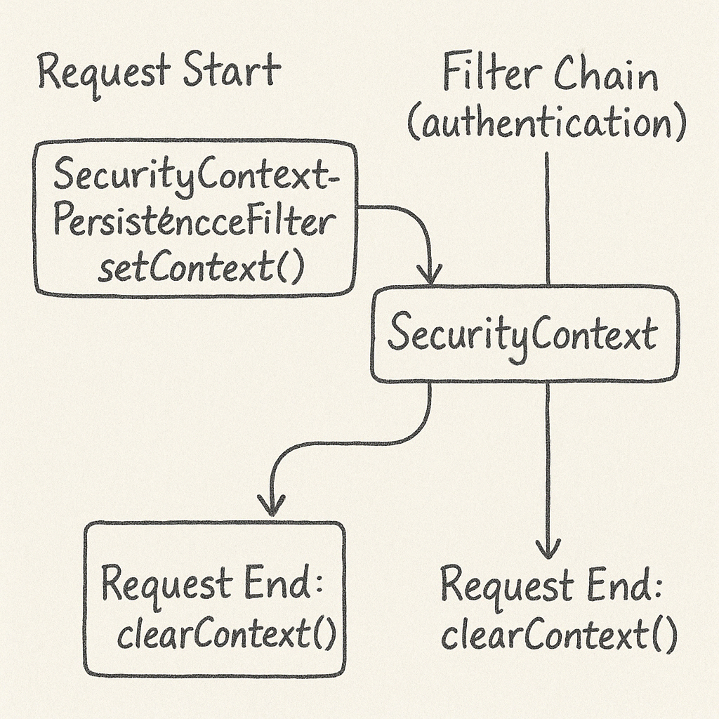 clearContext()를 호출하여 ThreadLocal의 SecurityContext를 정리(remove)한다. - 따라서 개발자가 별도 정리 코드를 작성할 필요 없이 요청이 끝날 때마다 항상 ThreadLocal이 자동 초기화된다.
