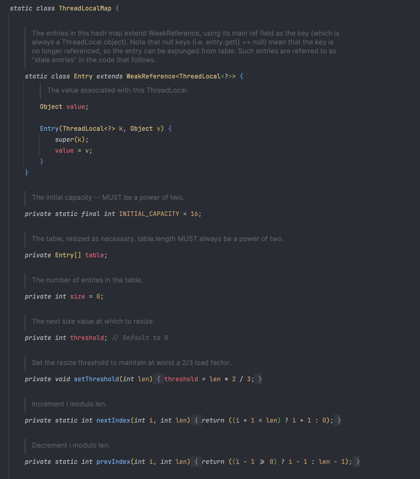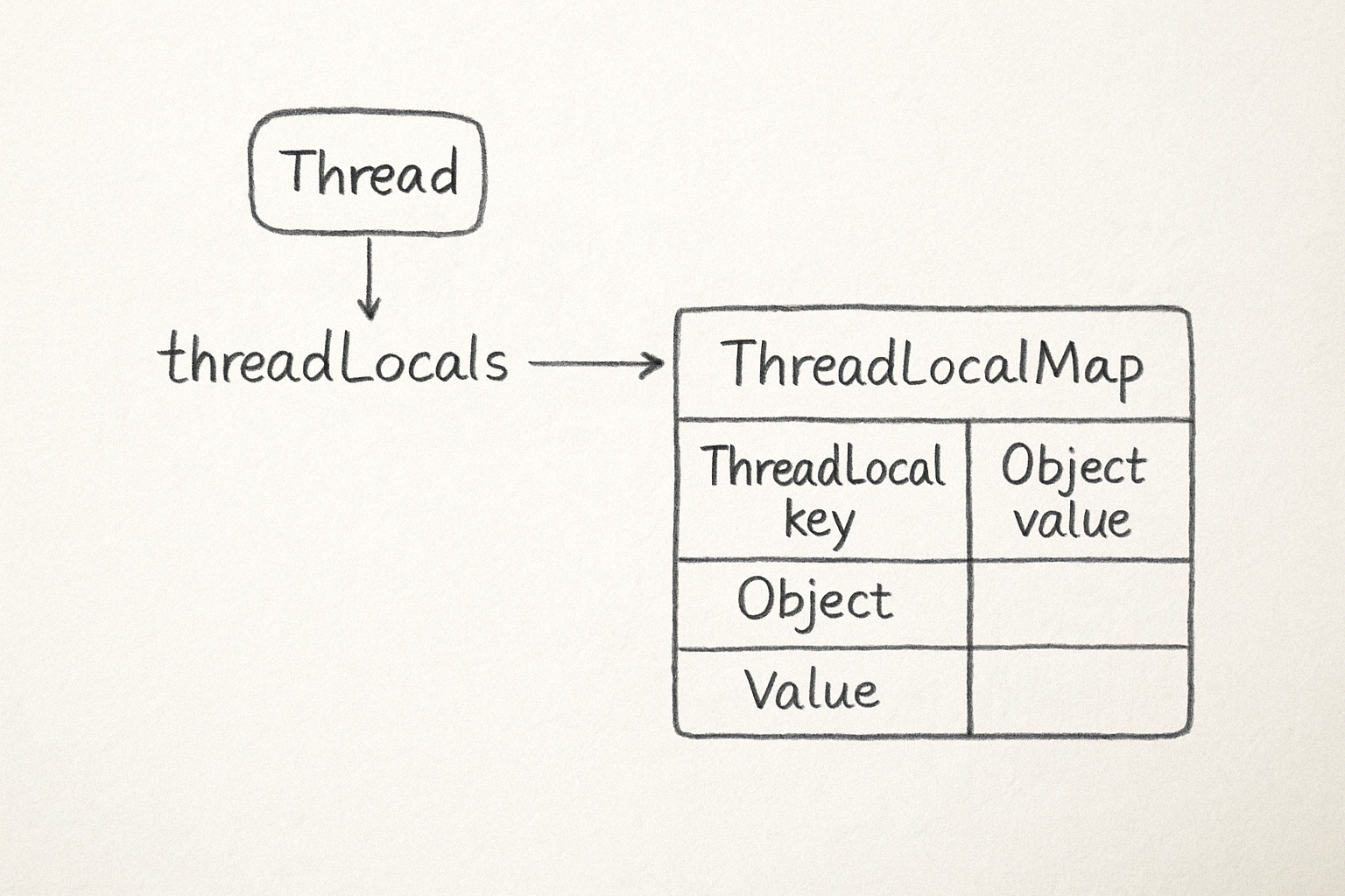 myThreadLocal.set(value)라고 하면, 결국 현재 스레드의threadLocals맵 안에myThreadLocal(키) →value(값) 가 저장된다. 따라서 스레드 A에서get()한 값과 스레드 B에서get()한 값은, 서로 다른 Map에서 찾게 되므로 충돌이 없다. ThreadLocalMap은 해시 테이블과 유사한 구조를 가지며, 키로ThreadLocal인스턴스를 사용한다.ThreadLocalMap.Entry라는 전용 내부 클래스를 갖고, 각 엔트리에 (ThreadLocal key, Object value) 쌍을 저장한다.