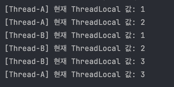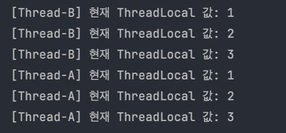 System.out.printf("[%s] 현재 ThreadLocal 값: %d%n", threadName, threadLocalCount.get());