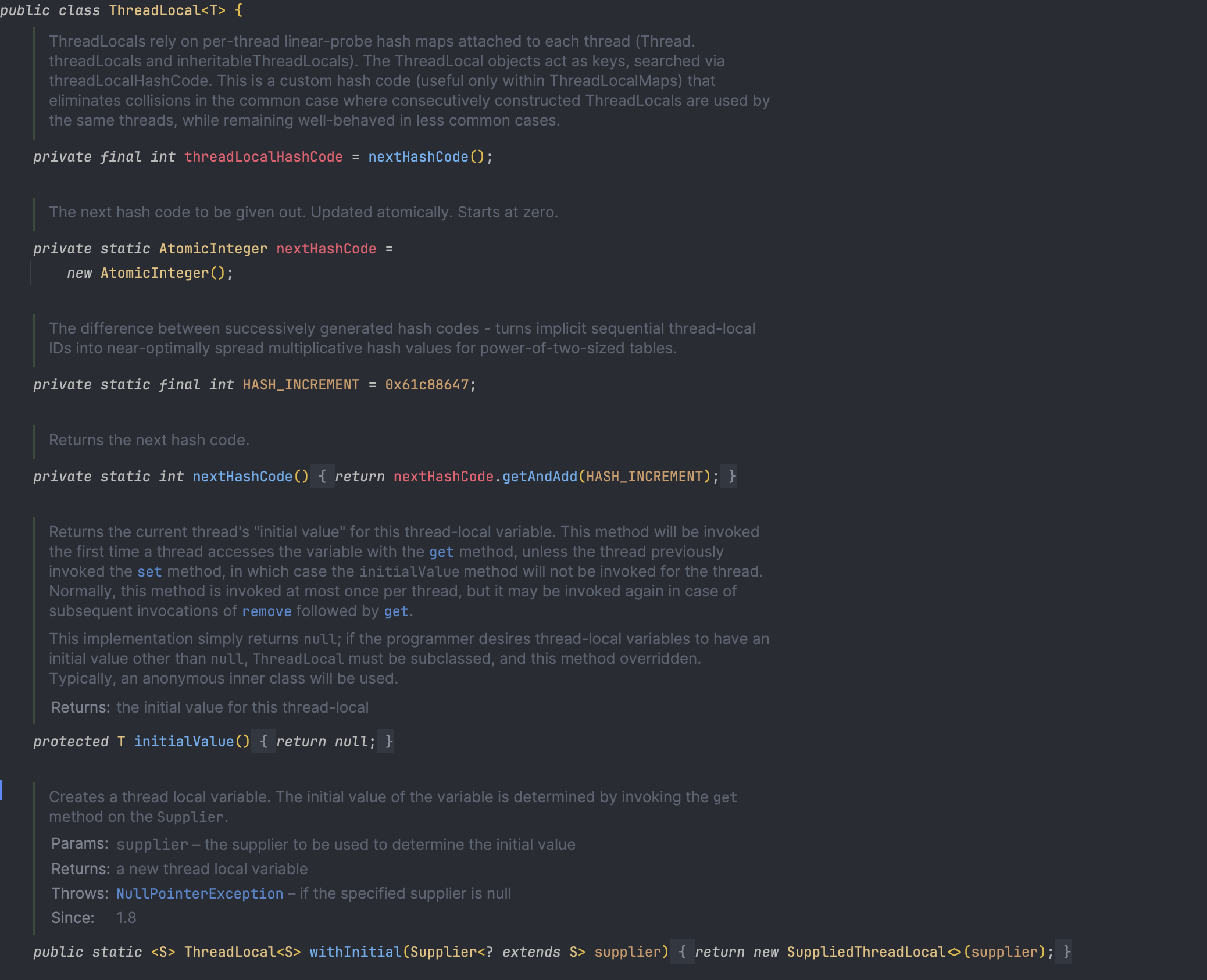 get(): 현재 스레드의 ThreadLocalMap에서 할당된 값을 반환한다. 값이 없으면 보통 null을 리턴하지만,withInitial()을 통해 초기화 로직을 제공하면 자동으로 초기값을 생성하여 넣어준다.set(T value): 현재 스레드의 ThreadLocalMap에value를 저장한다.remove(): 현재 스레드에서 이 ThreadLocal에 해당하는 값을 삭제한다. (내부적으로ThreadLocalMap.remove(this)호출)withInitial(Supplier<? extends T> supplier): ThreadLocal 인스턴스 생성 시 초기화 로직을 람다로 받는 정적 메서드.new ThreadLocal<T>() { protected T initialValue() {...} }형태를 간소화한 것이다.