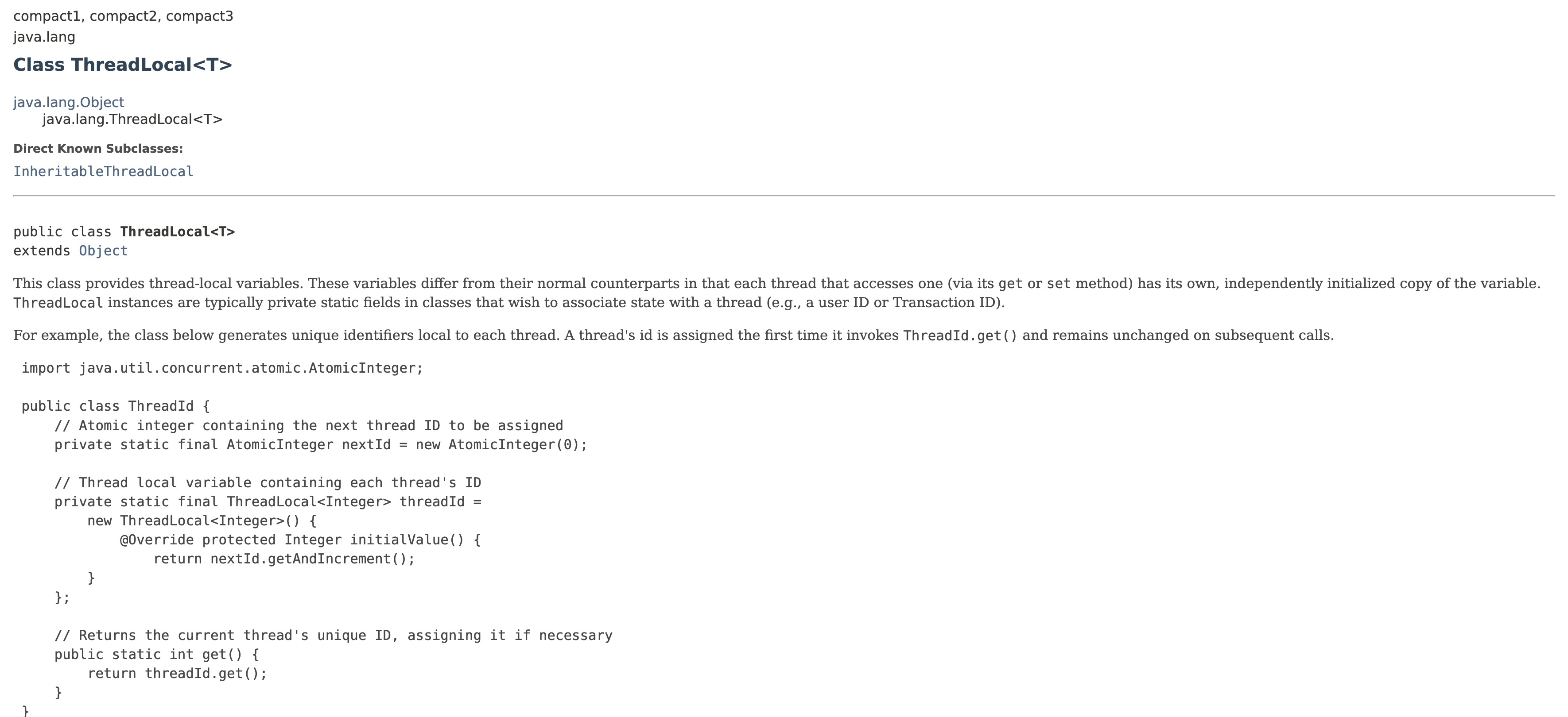 - https://docs.oracle.com/javase/8/docs/api/java/lang/ThreadLocal.html#:~:text=%2A%20