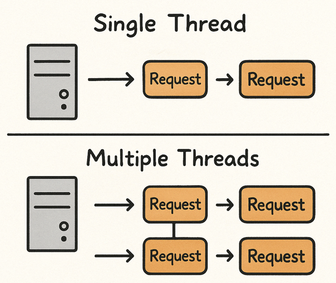프로그램이 단일 스레드로 동작한다면, 한 번에 하나의 작업만 처리할 수 있다. 이는 CPU 코어가 여러 개인 시대에 비효율적일 뿐 아니라, 동시 접속이 많은 서버 환경에서 병목을 유발한다. 그래서 대부분의 서버 애플리케이션은 멀티스레드(또는 이벤트 루프, 비동기 I/O 등)를 통해 동시에 여러 요청을 처리한다.