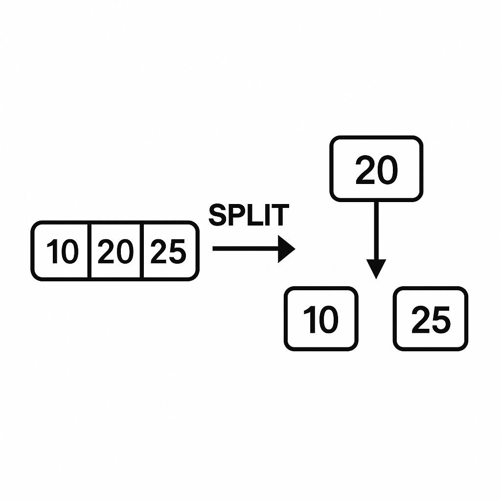 - 삽입 시: 노드가 가득 차면(Split) 중간 키(Median Key) 를 부모 노드로 이동시키고, 노드를 분할(Split) 한다.