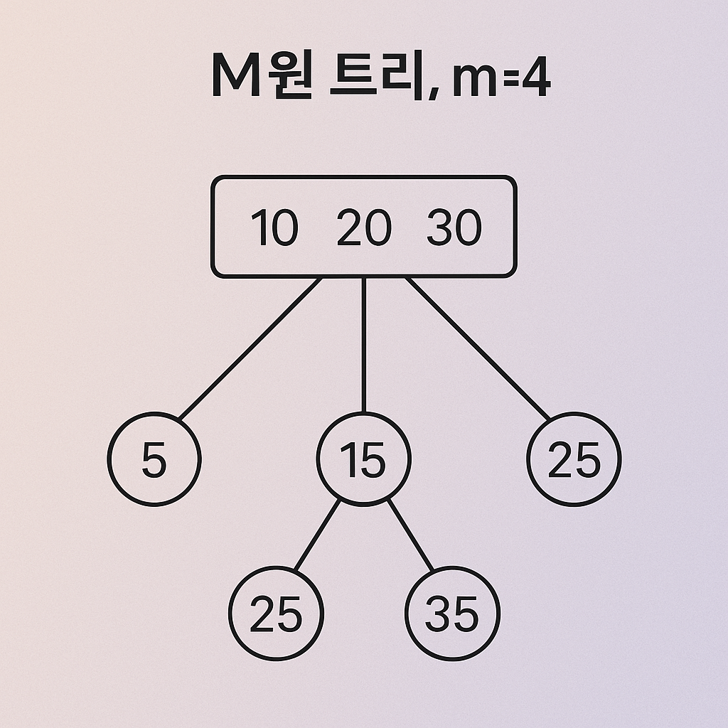 M원 트리(M-ary Tree) 는 각 노드가 최대 M개의 자식 노드를 가질 수 있는 다원 트리(Multi-way Tree) 를 의미한다. 이 구조에서는 노드 하나가 여러 개의 키(Key) 와 자식 노드 포인터(Child Pointers) 를 동시에 저장한다. 따라서, 데이터 검색 경로가 짧아지고, 트리의 깊이가 얕아지며, 디스크 접근 횟수가 감소한다.