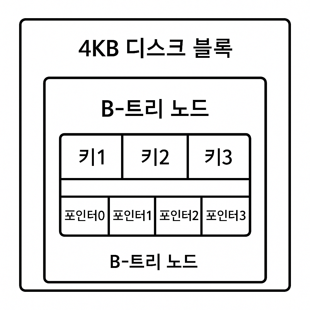 4KB일 때, B-트리 노드는 이 크기에 맞춰 키와 포인터를 저장하도록 구성된다.