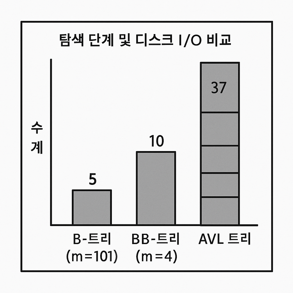 또한, B+트리와 같은 변형은 범위 조회의 효율성을 더욱 높여 데이터베이스 인덱싱에 최적화된 구조를 제공한다. 반면, BST, AVL 트리, BB 트리는 메모리 기반 시스템에서는 효과적일 수 있으나, 디스크 기반 시스템에서의 성능 최적화 측면에서는 B-트리 계열에 비해 열세이다.