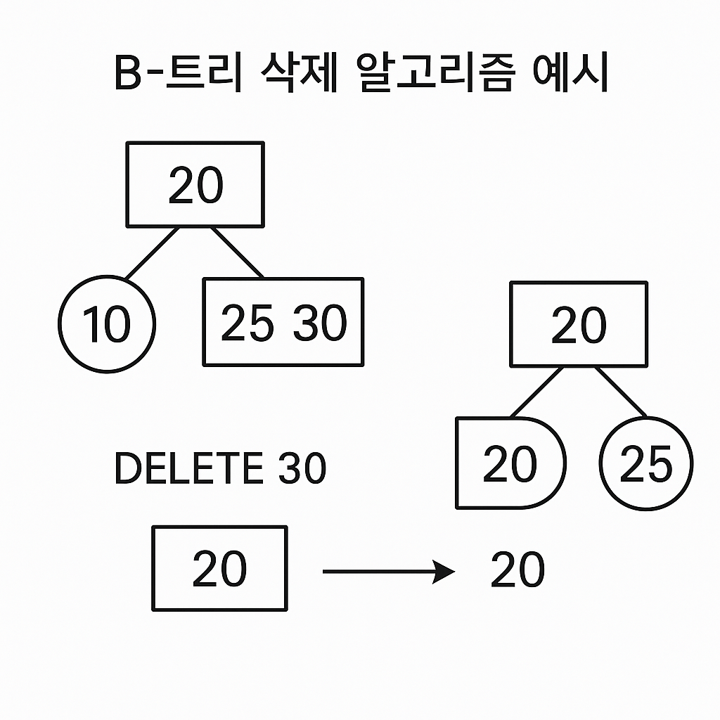 - 삭제 시: 키가 부족하면 인접 노드에서 재분배(Redistribute) 하거나 병합(Merge) 을 수행해 균형을 유지한다.