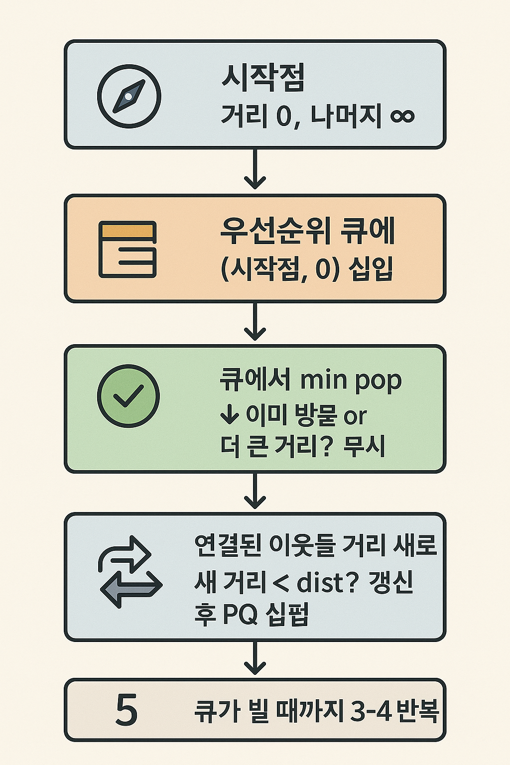 - 예: A에서 B까지 최단 거리가 5라고 확정했다면, 다른 경로를 더 탐색해도 “5보다 더 작은 값”은 나올 수 없다고 보는 것이다.