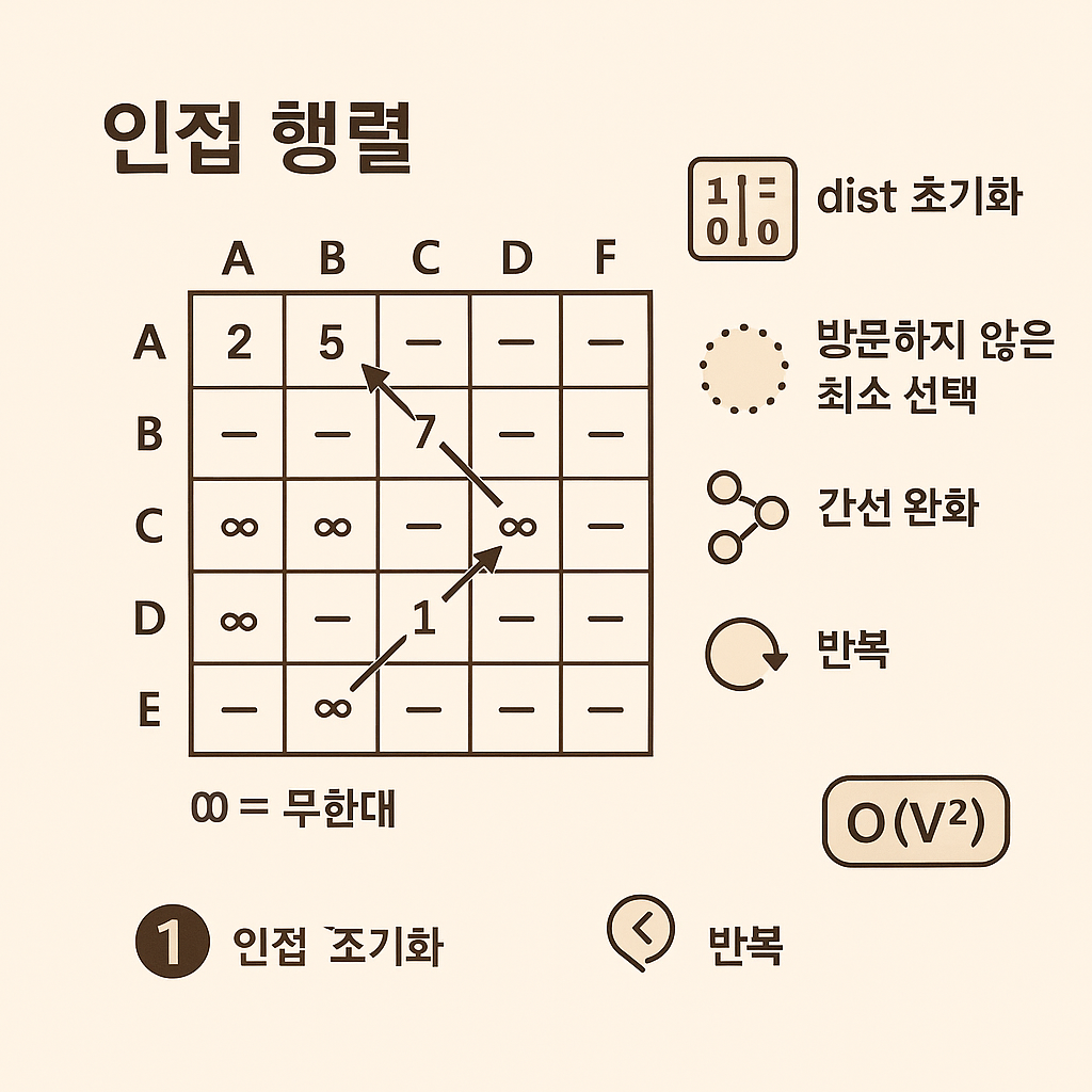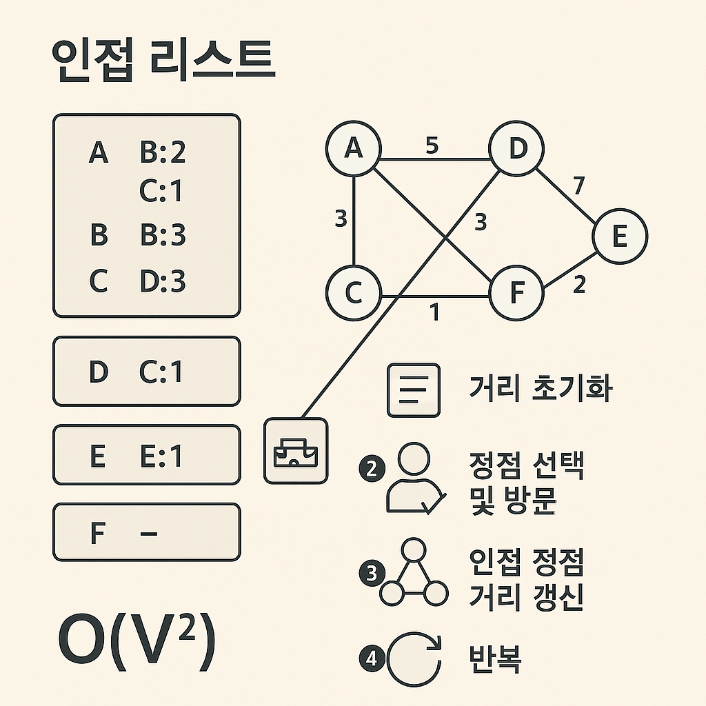 - V, E가 크지 않은 경우엔 2차원 행렬 방식도 쓰이지만, 수만 이상으로 커지면 인접 리스트 + 우선순위 큐 방식이 효율적