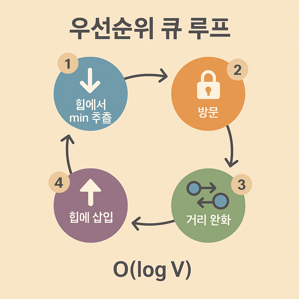 - “가장 짧은 dist를 가진 정점”을 우선순위 큐에서 O(log V)에 꺼냄