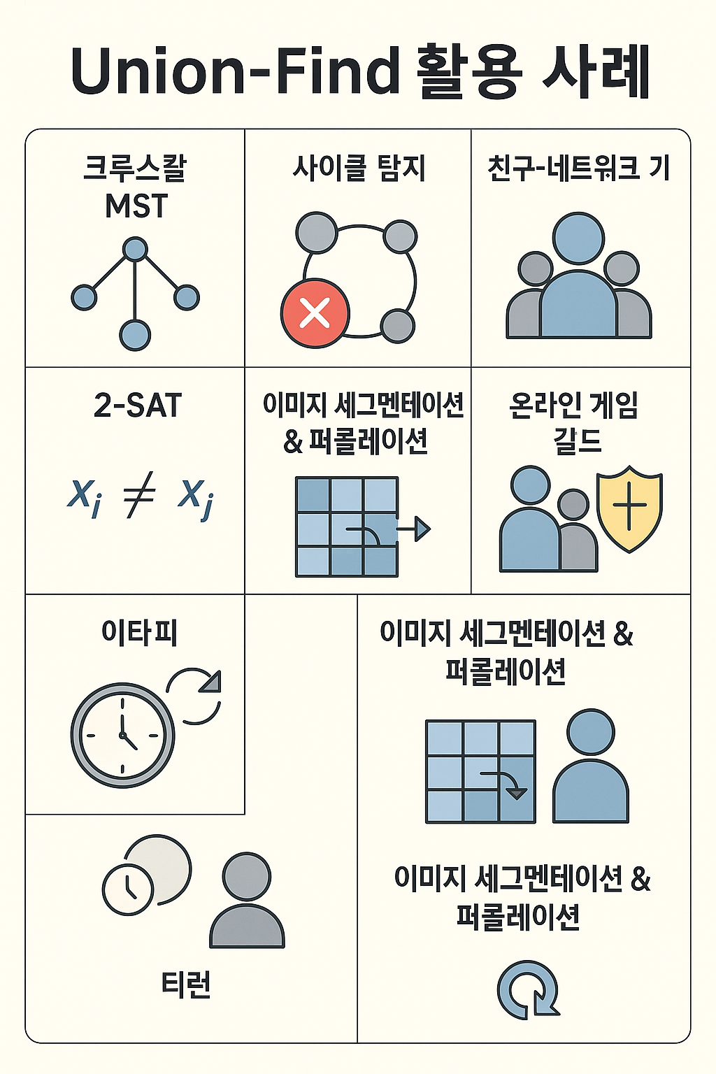 챕터 1에서 다룬 상호배타적 집합을 컴퓨터 메모리 위에 구현한 셈이므로, “서로 섞여 있지 않은 그룹들을 동적으로 관리”하는 상황에서 빛을 발한다.