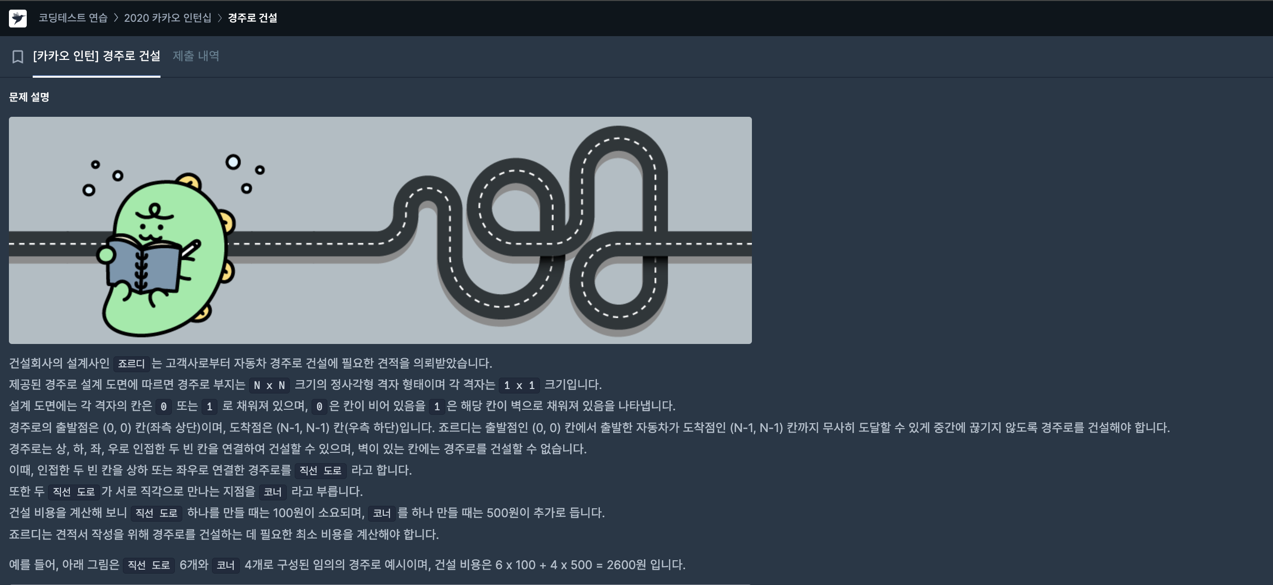 여기서 “연결”은 단순히 칸을 밟는 것이 아니라 도로를 시공하는 행위다. 같은 축으로 이어지는 구간은 직선 도로이며 한 칸마다 100원이 든다. 진행 방향이 달라져 직각이 되는 지점은 코너로 간주해 500원을 추가 낸다. 즉 직선 1칸 = 100원, 코너 1회 = 100 + 500 = 600원이 된다. 목표는 출발점에서 도착점까지 도로를 놓으면서 총 비용을 최소화하는 것이다.