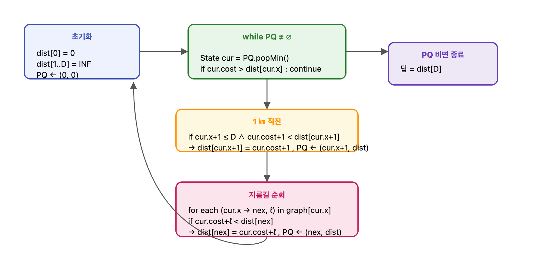 따라서 “지름길이 부족해서 dist[D] 가 영원히 INF로 남는다” 같은 상황은 애초에 발생할 수 없다. 지름길이 있으면 더 좋은 값으로 덮어쓰고, 없으면 직선 값 그대로 남는다는 안전한 구조가 보장된다.