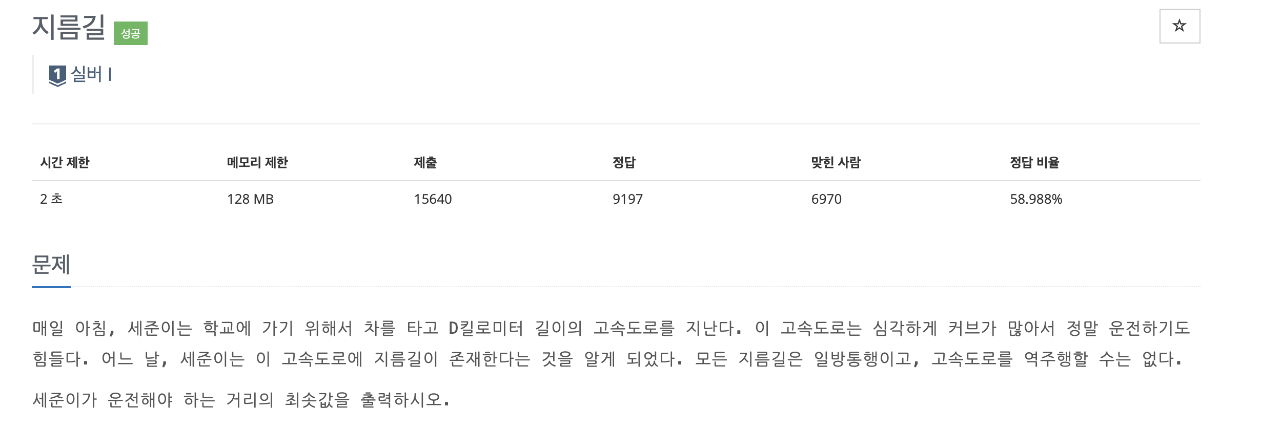 고속도로의 길이 D ㎞가 주어진다. 매 1 ㎞마다 좌표 0 ~ D 까지 번호를 매겨 한 줄로 늘어놓고, 몇몇 구간에는 일방통행 지름길이 놓여 있다. 지름길은 시작 좌표 → 끝 좌표 (길이 ℓ) 로 표현되는데, ℓ이 원래 거리(끝−시작)보다 짧을 때에만 “지름”이라는 이름값을 한다. 우리는 0에서 출발해 역주행 없이 D까지 달린다. 매번 1 ㎞ 직선으로 가거나, 지금 서 있는 좌표에서 시작하는 지름길을 탈 수 있다. 목적지까지 총 주행 거리를 최소화하는 것이 목표다.