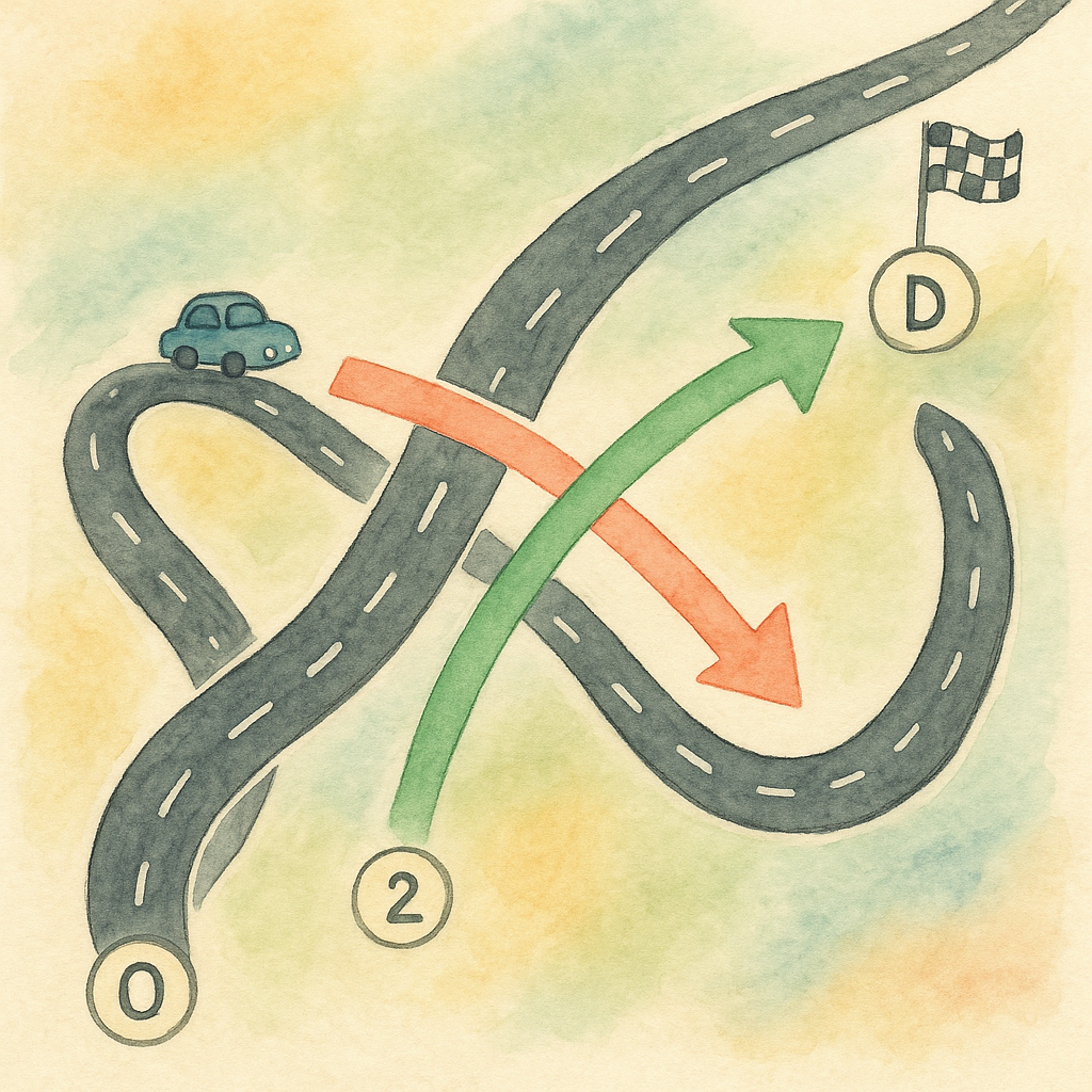 그런데 항상 그럴까? 즉, "매번 지름길이 등장하면 무조건 선택해서 가는 게 전체 거리도 최소가 될까?" 예컨대 아래처럼 짧은 길이 있다고 상상해보자.