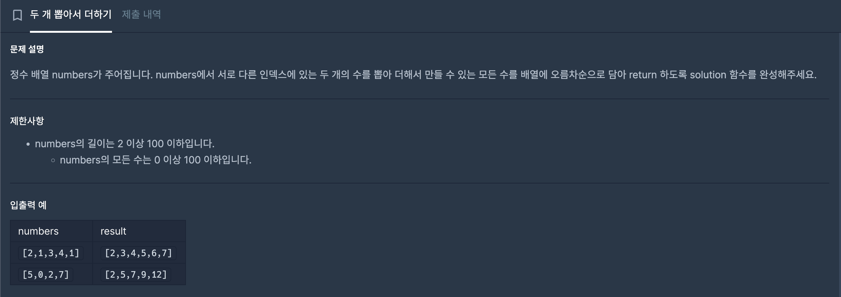 정수 배열 numbers가 주어집니다. numbers에서 서로 다른 인덱스에 있는 두 개의 수를 뽑아 더해서 만들 수 있는 모든 수를 배열에 오름차순으로 담아 return 하도록 solution 함수를 완성해주세요.