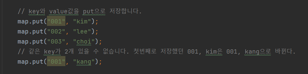 // 같은 key가 2개 있을 수 없습니다. 첫번째로 저장했던 001, kim은 001, kang으로 바뀐다.