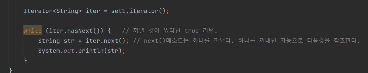 while (iter.hasNext()) { // 꺼낼 것이 있다면 true 리턴.