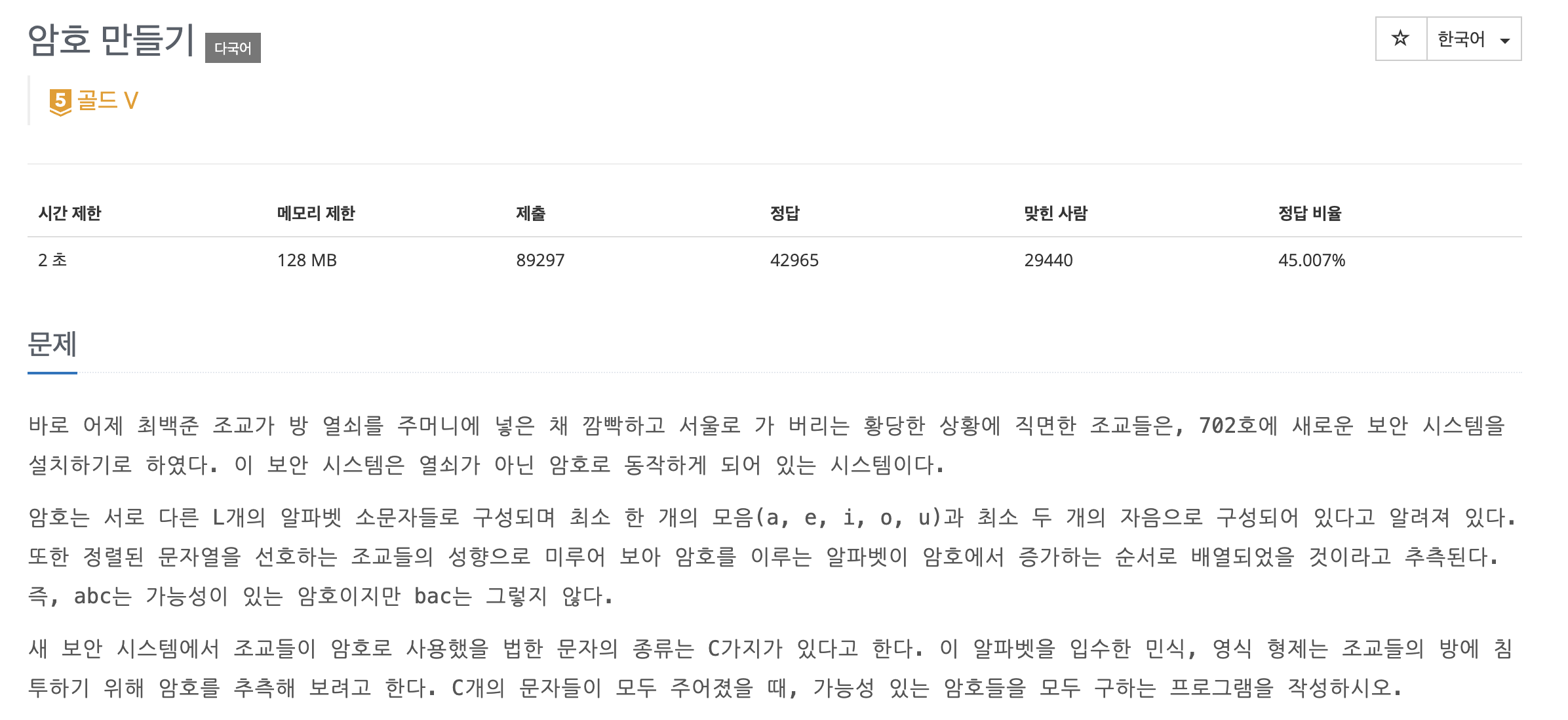암호는 서로 다른 L개의 알파벳 소문자들로 구성되며 최소 한 개의 모음(a, e, i, o, u)과 최소 두 개의 자음으로 구성되어 있다고 알려져 있다. 또한 정렬된 문자열을 선호하는 조교들의 성향으로 미루어 보아 암호를 이루는 알파벳이 암호에서 증가하는 순서로 배열되었을 것이라고 추측된다. 즉, abc는 가능성이 있는 암호이지만 bac는 그렇지 않다.
